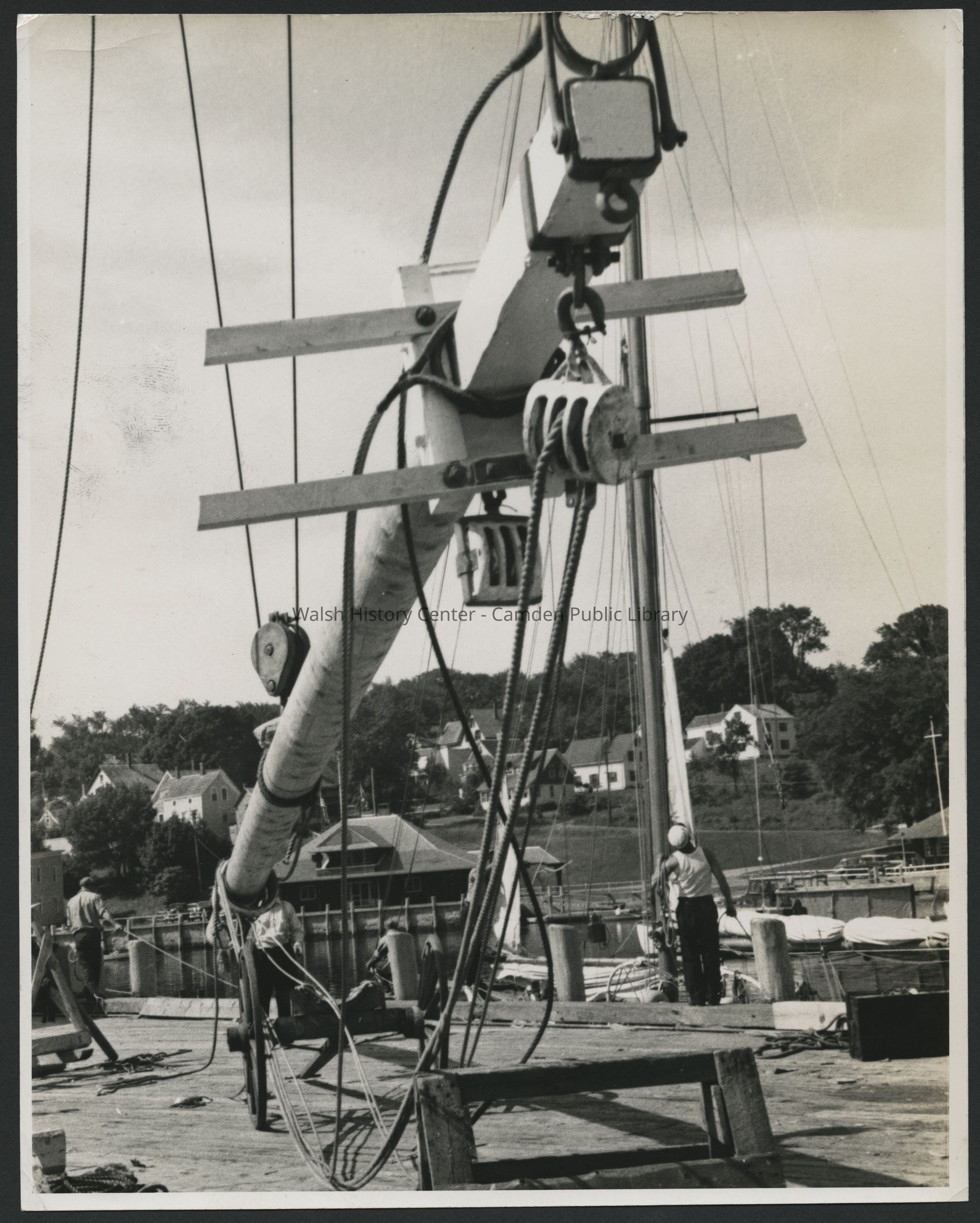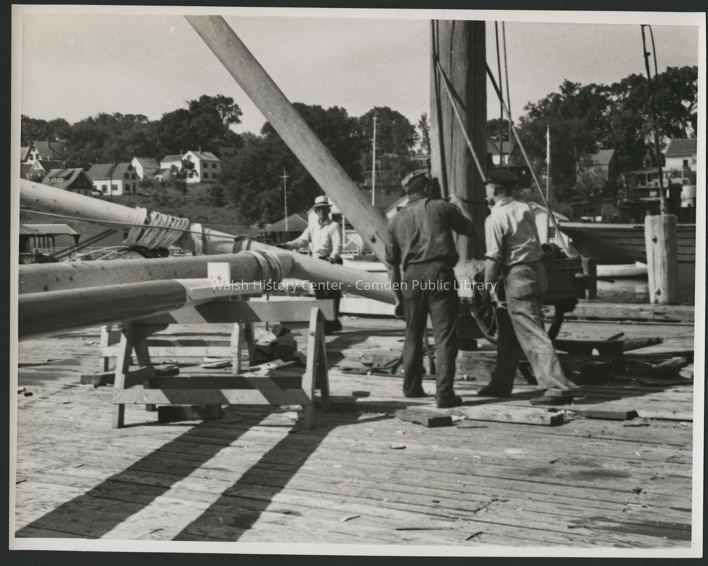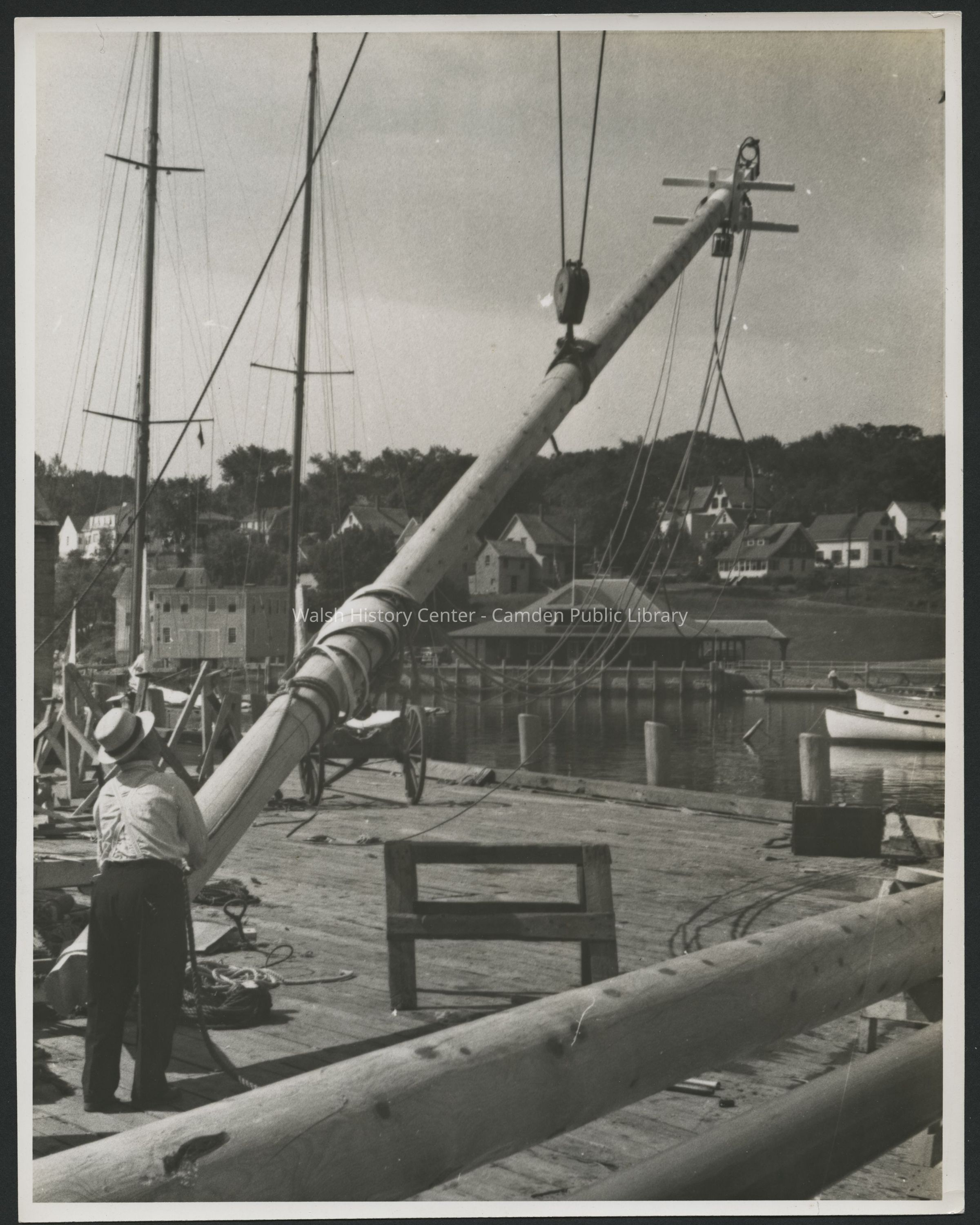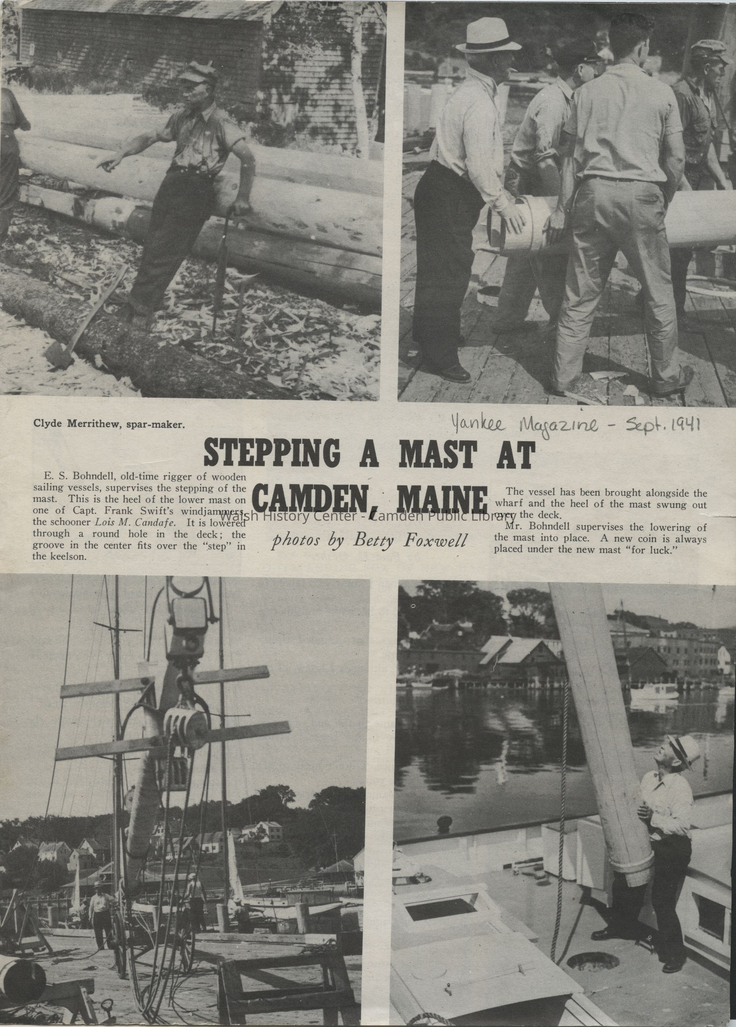 Thirteen photographs and one related article in Yankee Magazine (September 1941) about stepping a mast at the Camden shipyard in Camden, Maine. Article written by Betty Foxwell and features pictures of master sparmaker Clyde Merrithew and sailmaker E.J. Bohndell.Collection