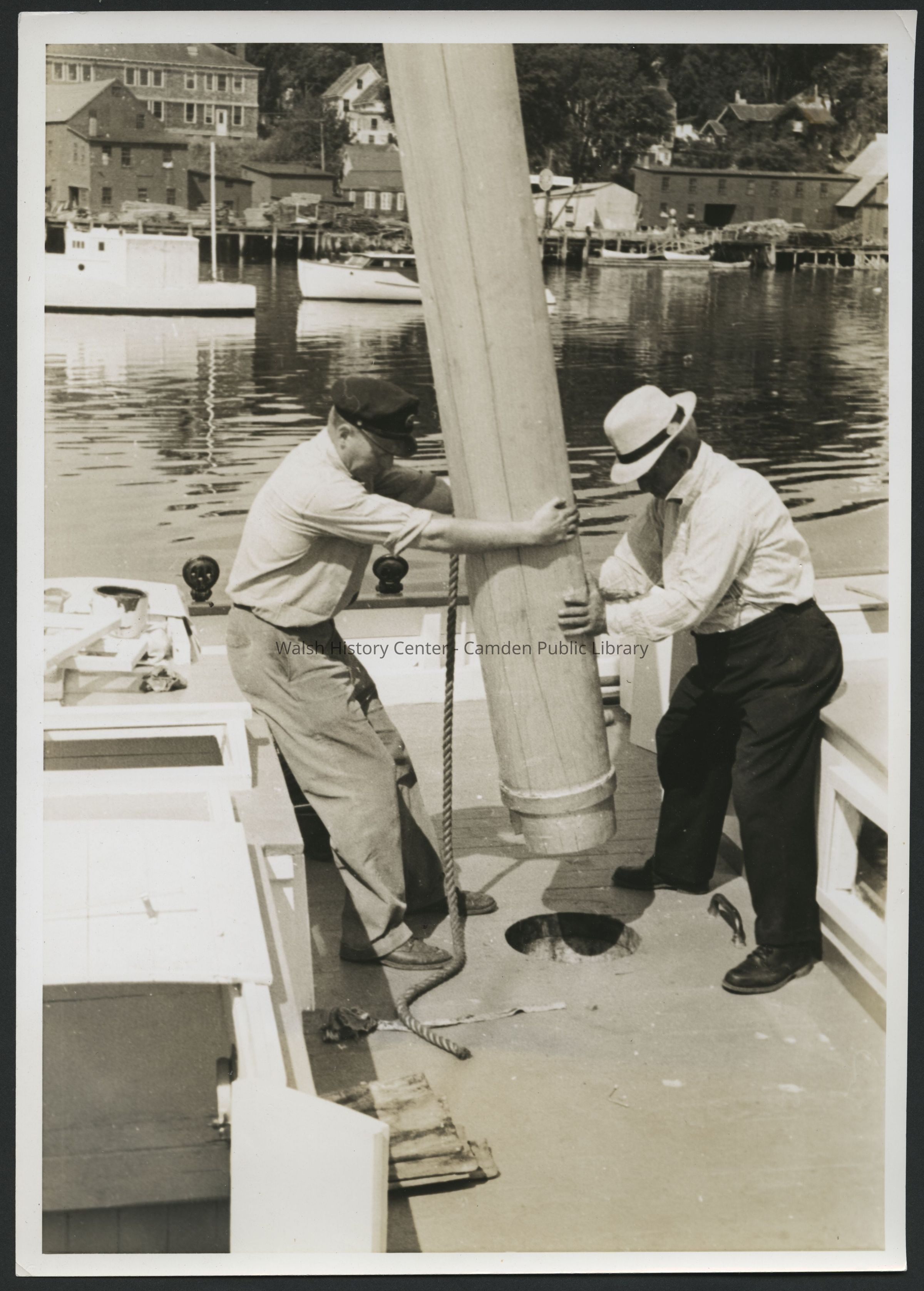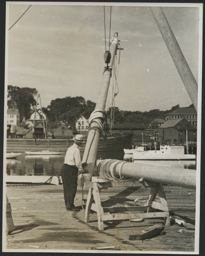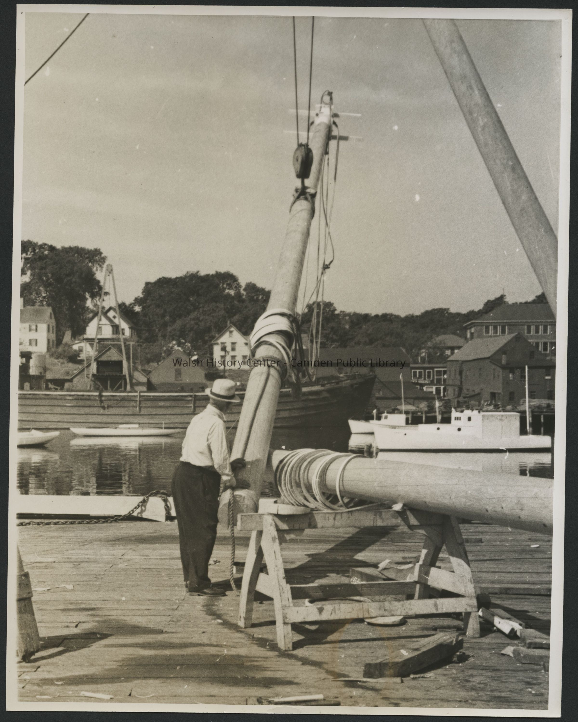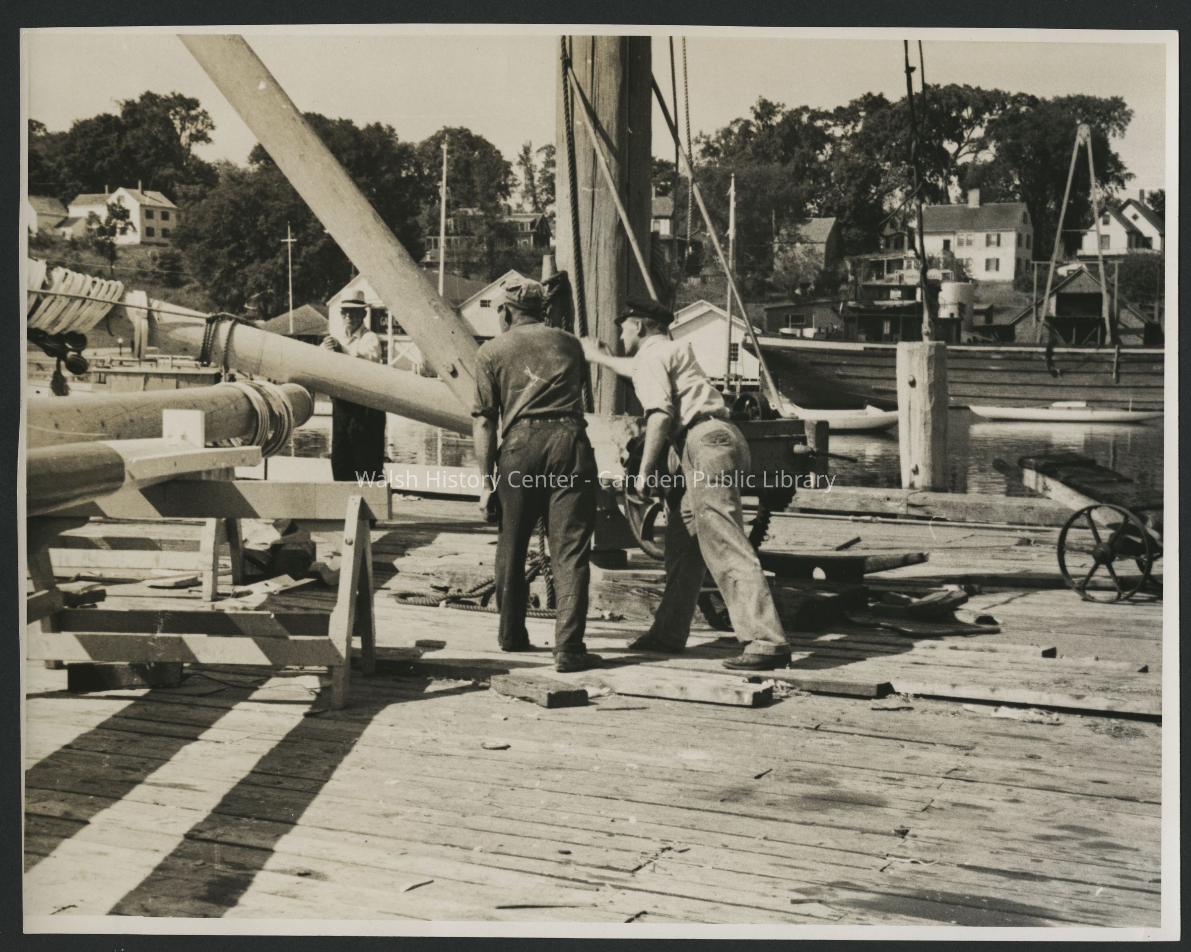 Thirteen photographs and one related article in Yankee Magazine (September 1941) about stepping a mast at the Camden shipyard in Camden, Maine. Article written by Betty Foxwell and features pictures of master sparmaker Clyde Merrithew and sailmaker E.J. Bohndell.Collection