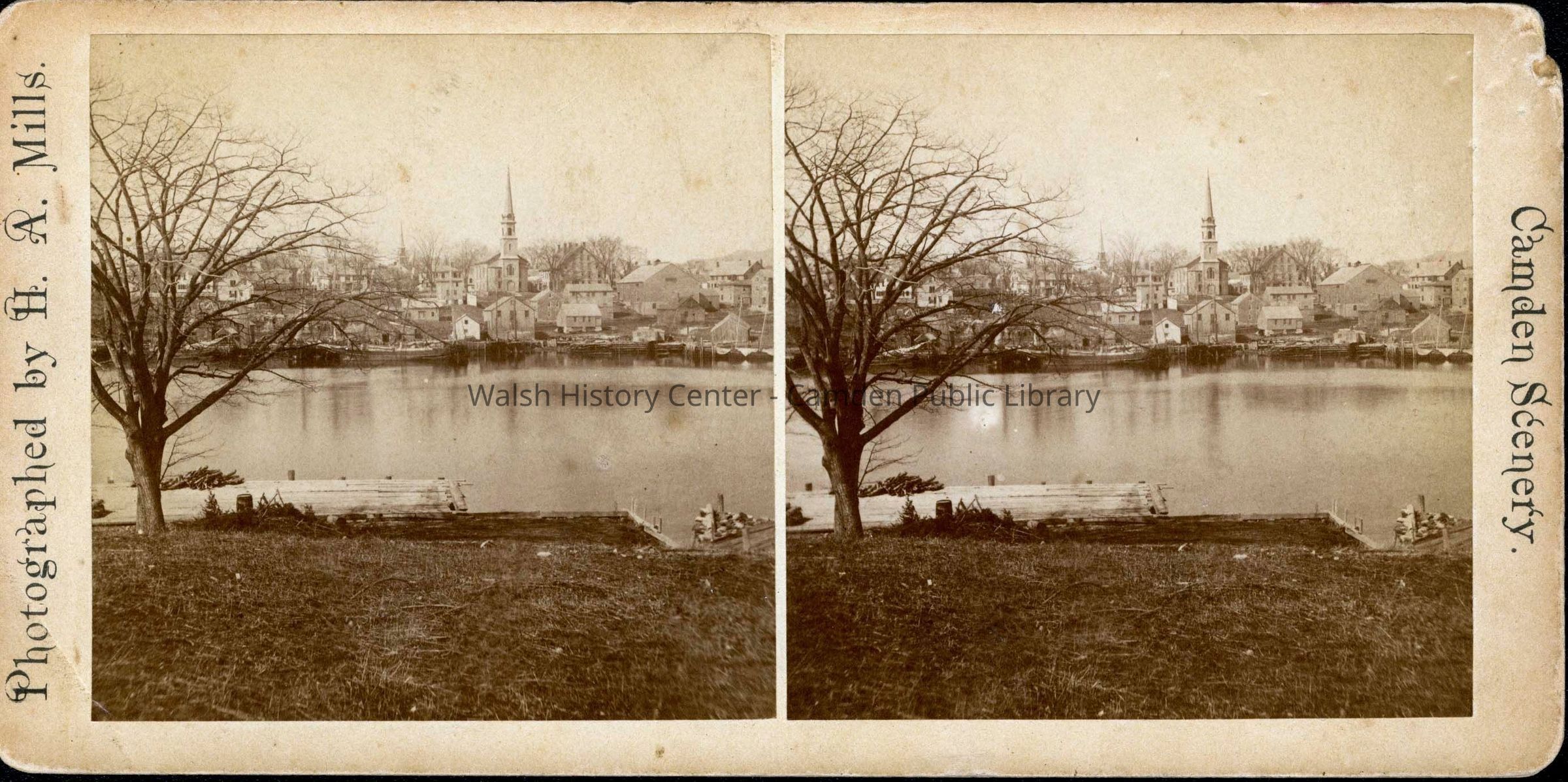 Stereoptic card with photograph of Camden harbor from Sea Street titled "Camden Scenery" by H. A. MillsCollection