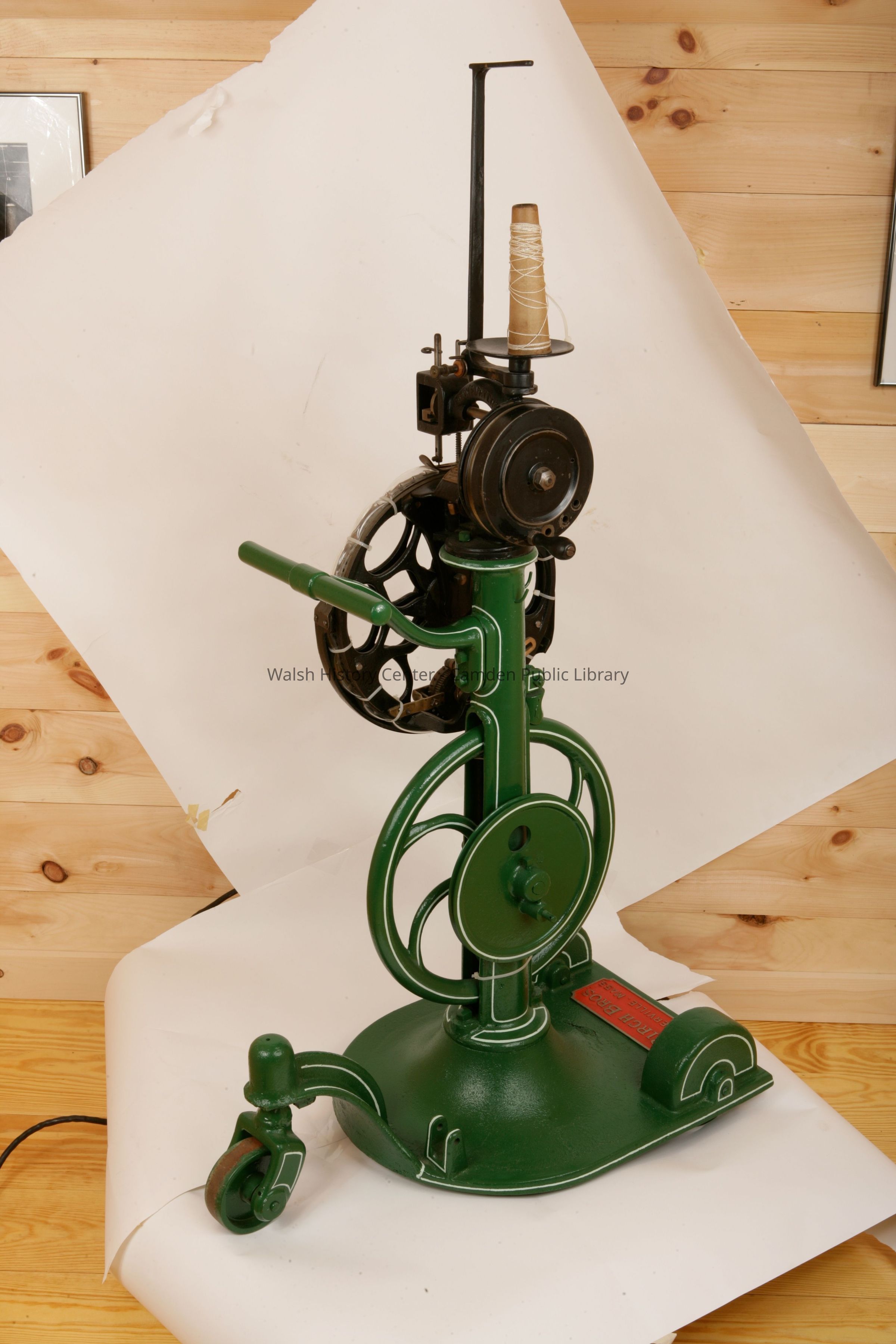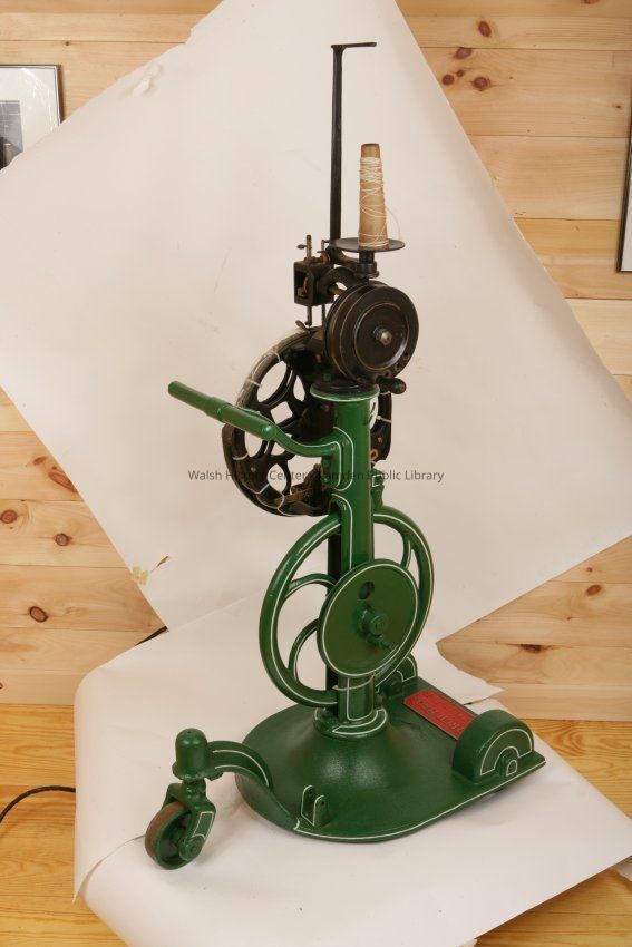 Large metal stitching machine, painted green, used at the Knox Mill.Collection
