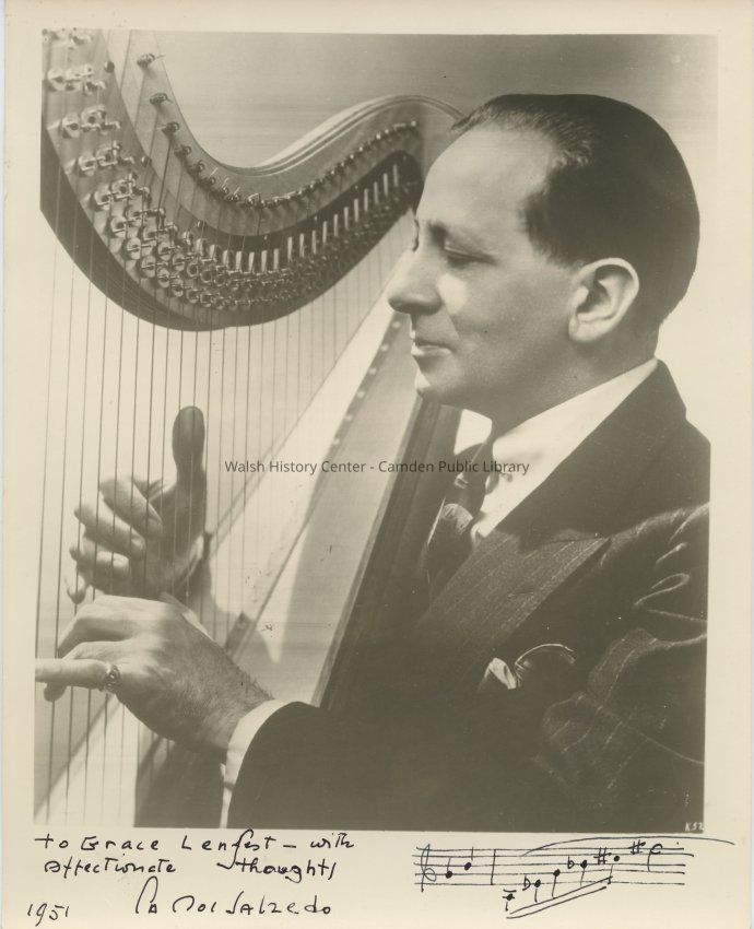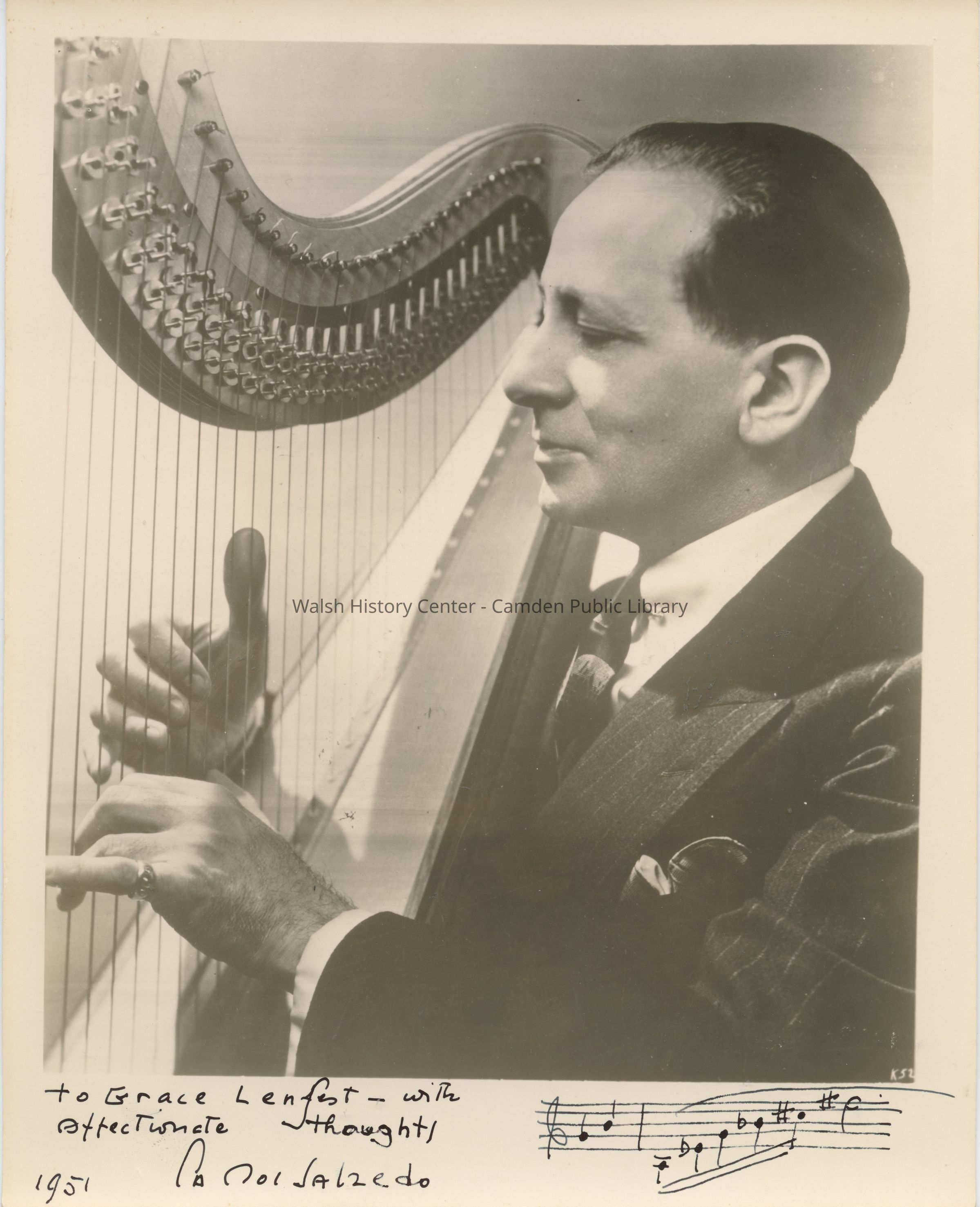 Black & white photograph of the Summer Harp Colony of America founder Carlos Salzedo playing the harp. Signed by Salzedo and given to his student Grace Lenfest in 1951. It is illustrated with a musical staff drawn by Salzedo in the lower right corner.Collection