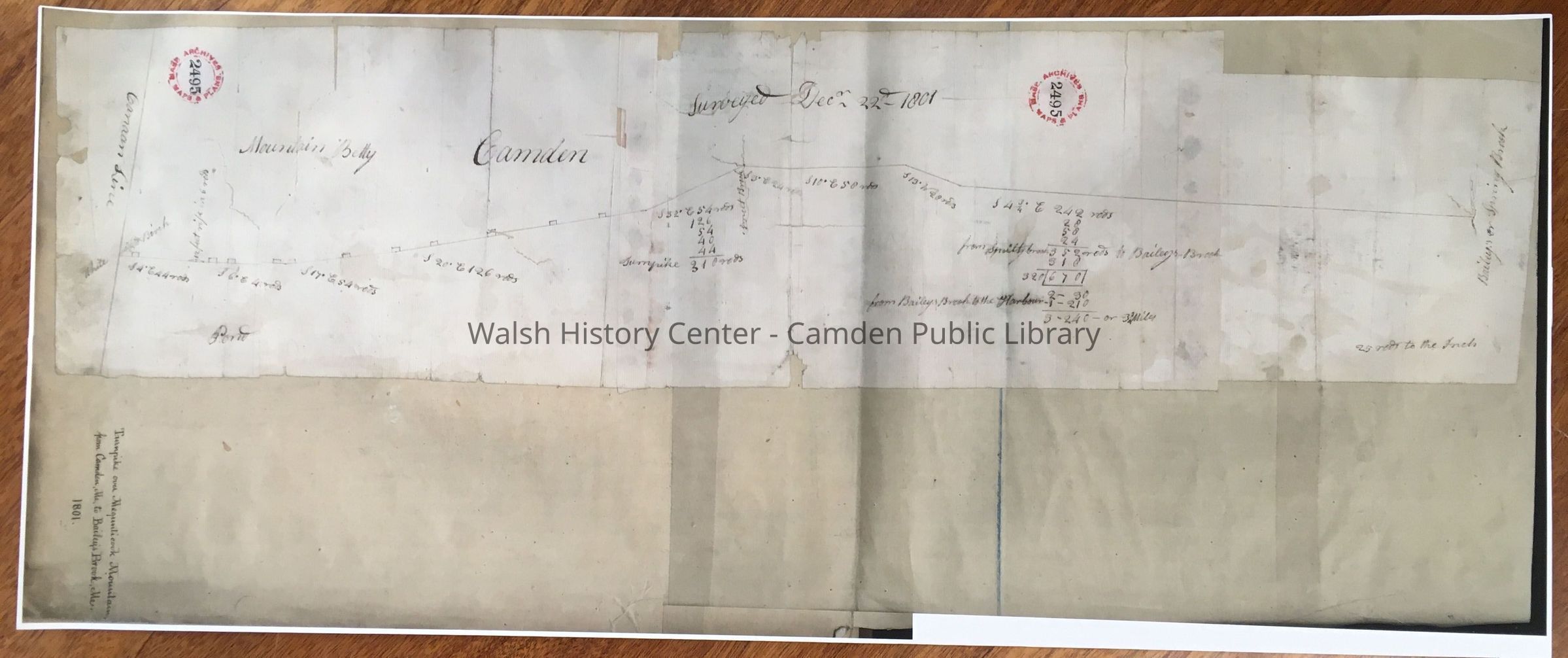 TURNPIKE OVER MEGUNTICOOK MOUNTAIN from Camden, Me., to Bailey's Brook, Me. Color photocopy, full size of original, which is in Mass. Archives, Maps & Plans No. 2495. This map is a survey taken 22 December 1801, with "Bailey Brook or Spring Brook" at one end and "Canaan Line" at the other. Landmarks along the way are "Pond", "Mountain Betty", and "Smelt Brook". There is no north arrow, but the landmarks show that the title (which is on the backing paper and not on the original paper) is INACCURATE. It is written by another hand than that of the survey and appears upside down at the north end of the map. It is clear that the title was added by someone unfamiliar with the area. The route surveyed does not go over Megunticook Mountain and instead appears to align with Route 52. It may be part of a survey of the Turnpike built by Daniel Barrett starting in 1802. Gift of Sanford R. Delano, 5 October 2019.Collection