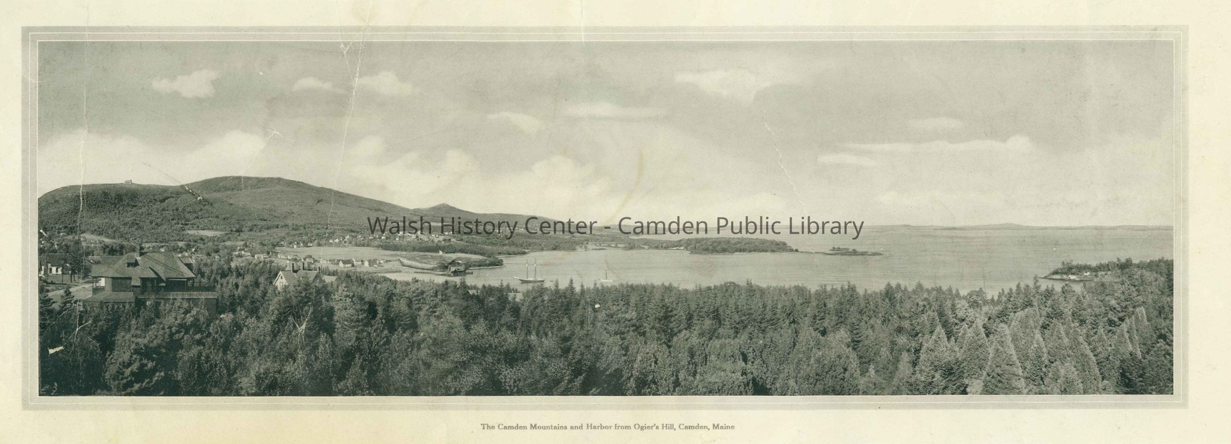 Panoramic printed image of the Camden mountains and harbor viewed from Ogier Hill. This is an enlarged print from J.R. Prescott's tourism booklet "Glimpses of Camden," published circa 1900.Collection
