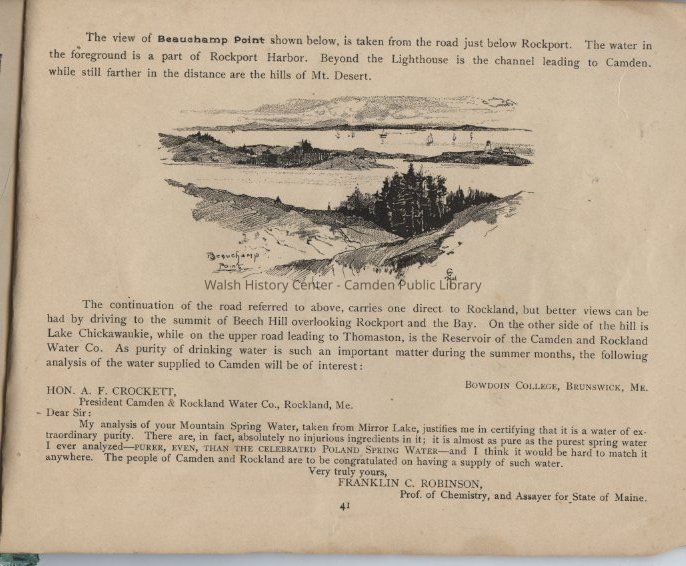 A. L. Bissell & Co., Bay View House, Beauchamp Point, Camden, Camden Harbor, Holly M. Bean & Co. Shipyard, Lake City, Maiden's Cliff, Maine, Megunticook Lake, Mt. Battie, N. T. Talbot & Son, Negro Island, Perry & Packard, Real Estate and Insurance, Ragged Mountain, Rockport, Rose Brothers, Pharmaceutists, Sherman's Point, TurnpikeOther Names and Numbers