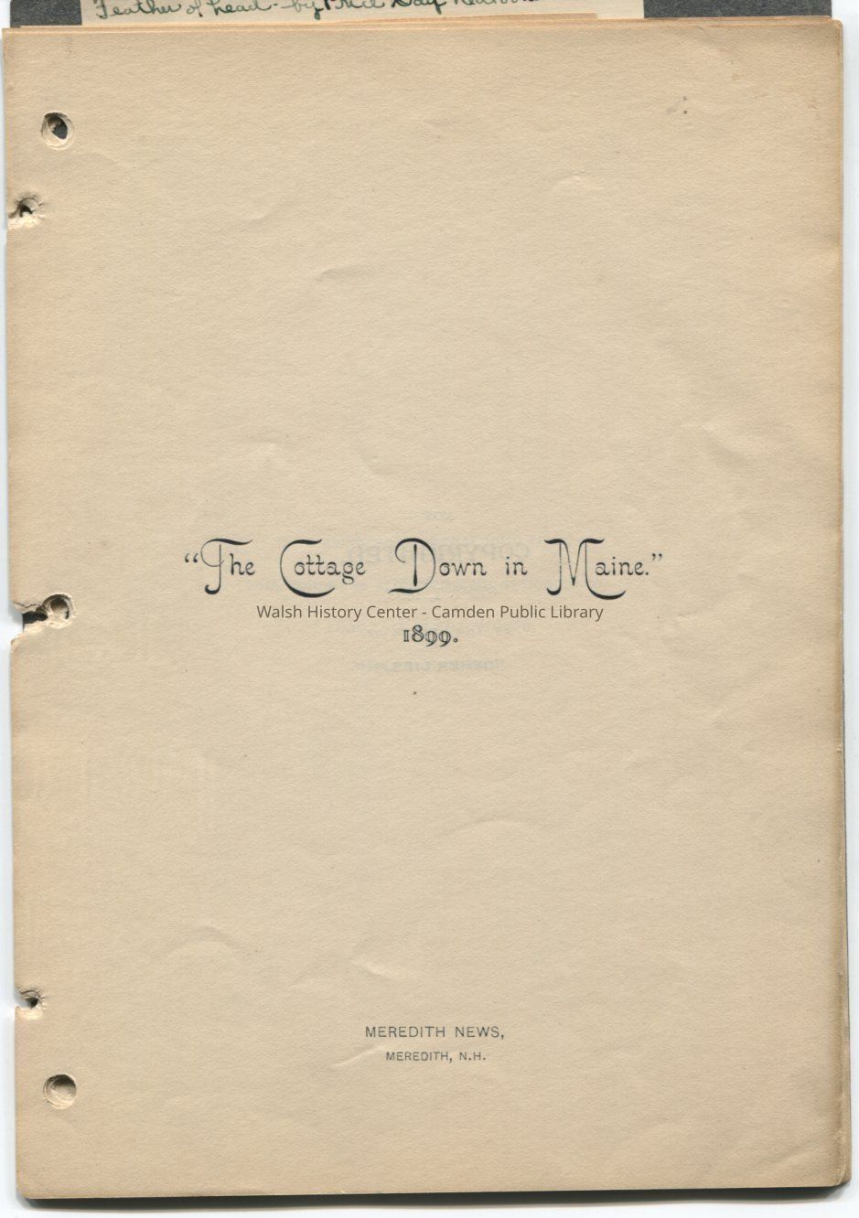 Small unpaginated book describing a July 1899 trip to Camden by a group of students from the Brewster Free Academy of Wolfeboro, New Hampshire chaperoned by Mrs. J.F. Tobin, the donor's grandmother. Mentioned in the text are John F. Tobin, Union Army captain in the Civil War and former Town Assessor of Camden, who owned a carriage and cabinet shop on Tannery Lane.