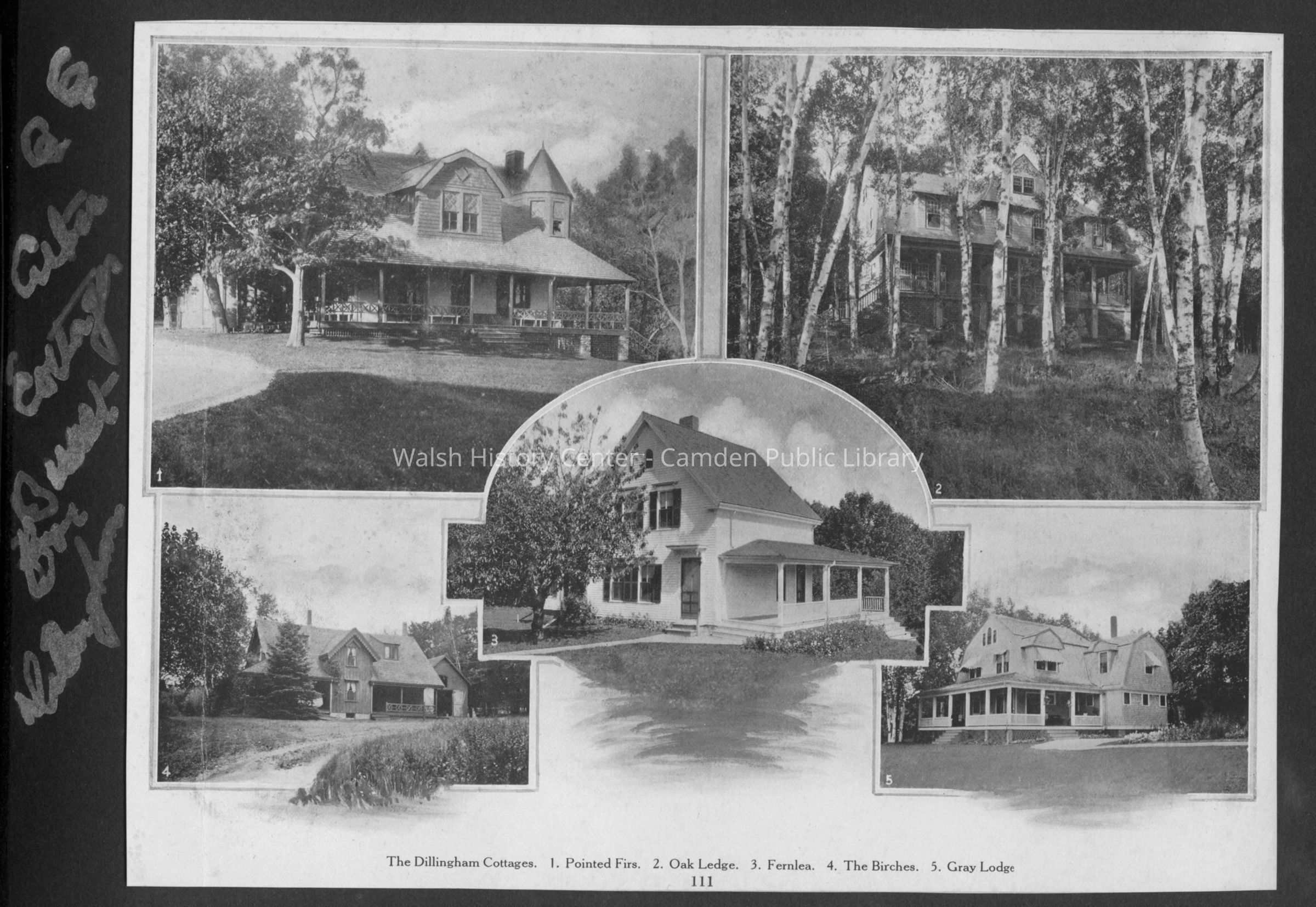 Scanned copy of page 25 of Cyrus Porter Brown leather photo album. Includes images of the Dillingham Cottages taken from one of JR Prescott's guidebooks "Glimpses of Camden." Includes Pointed Firs, Oak Ledge, Fernlea, The Birches, and Gray Lodge.Collection