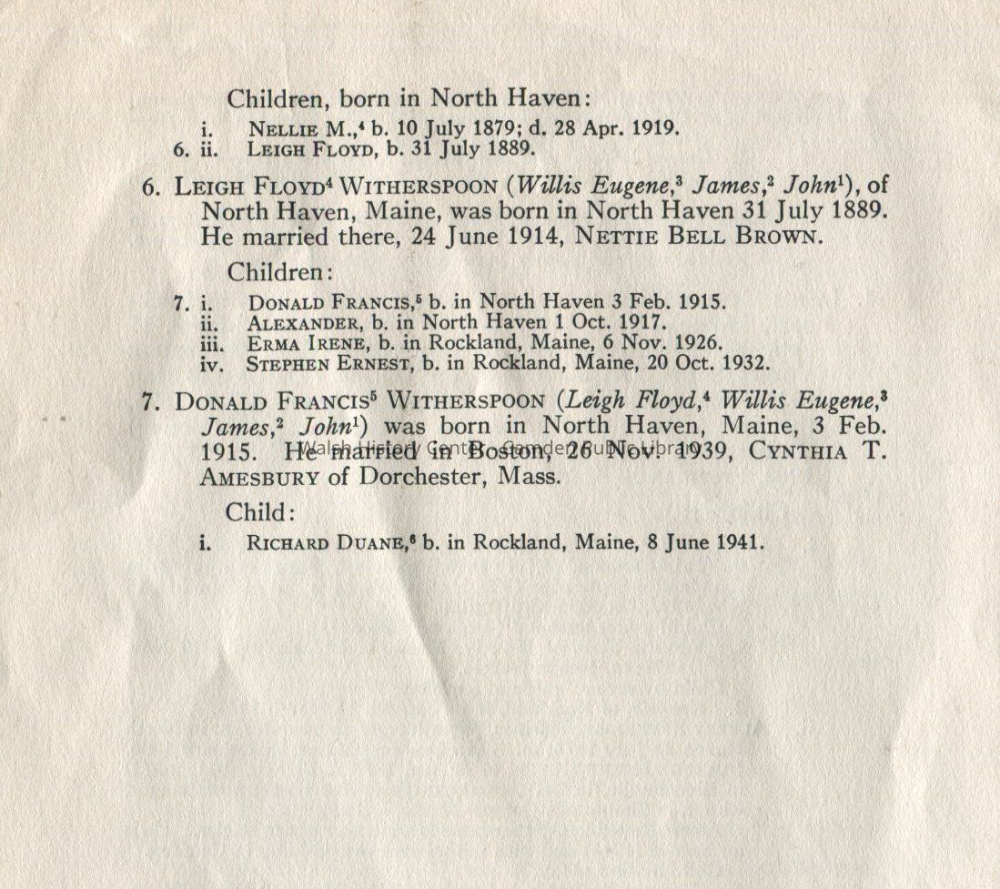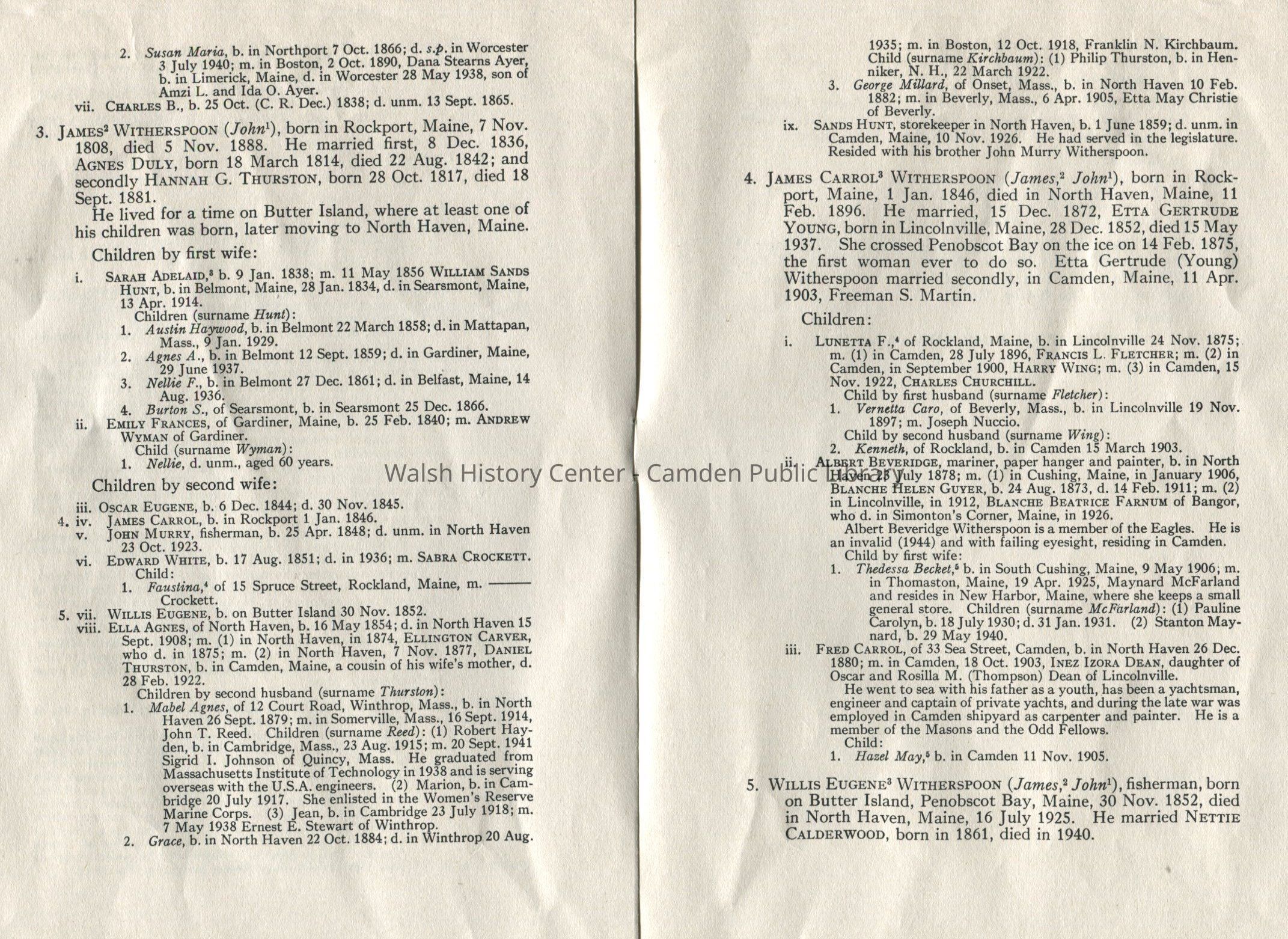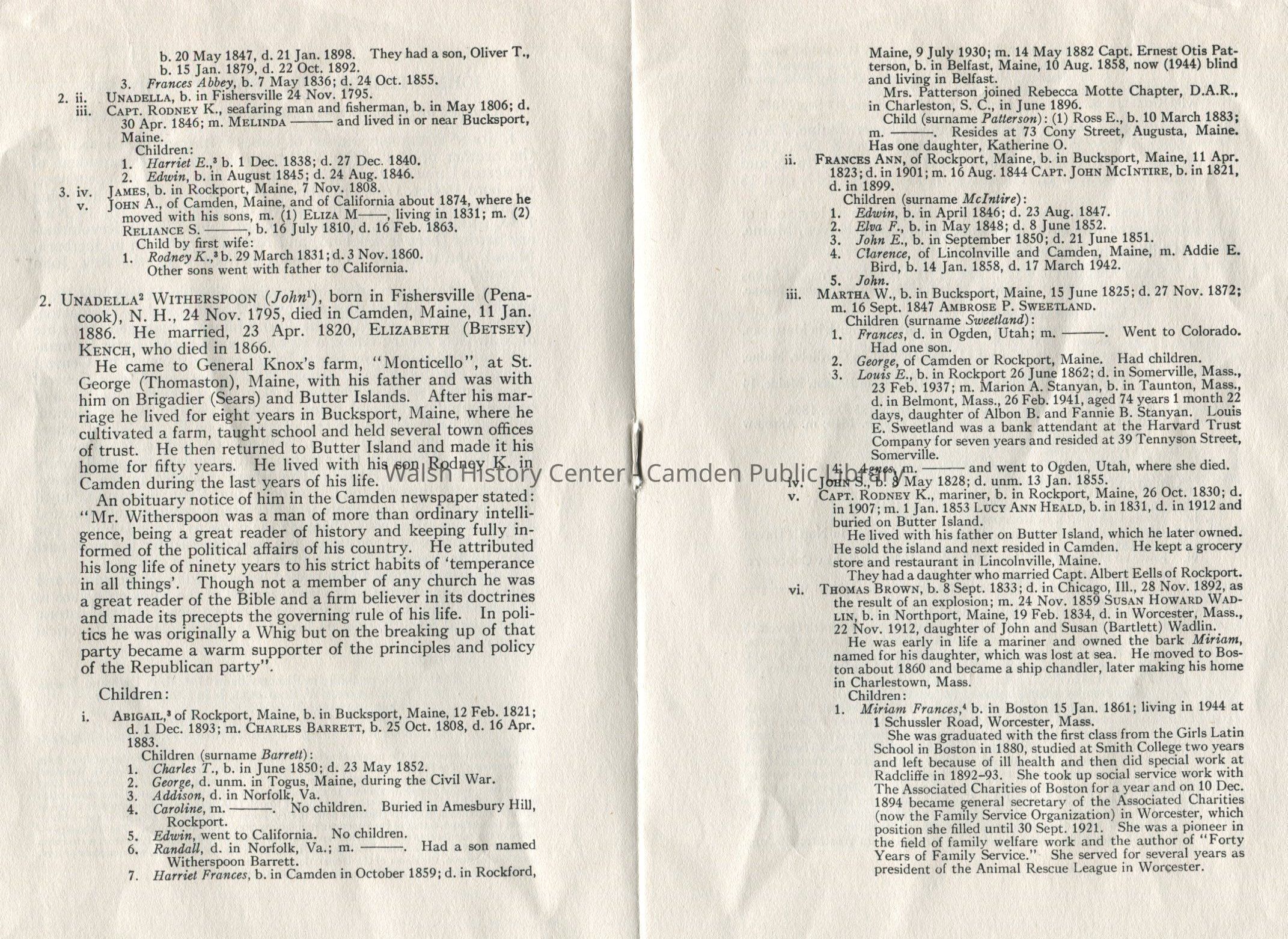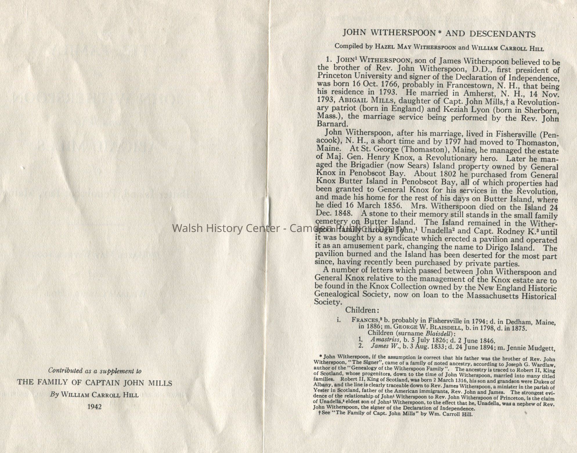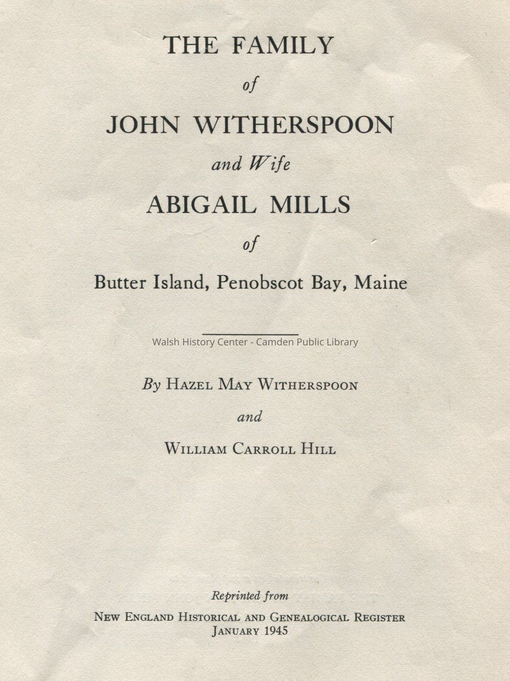 Genealogy of the family of John Witherspoon and Abigail Mills of Butter Island, Maine. Reprinted from the NEHG Register in January 1945. John Witherspoon managed General Henry Knox's estate, "Montpelier."