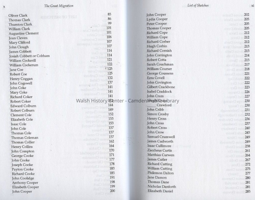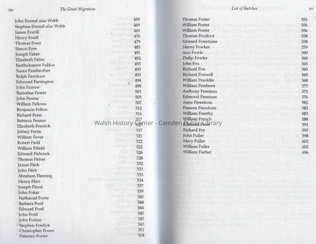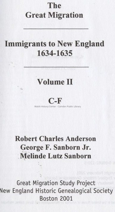 Detailed genealogical sketches of family surnames C-F immigrating to New England 1634- 1635. Indexes are provided by surnames, first names, places and ships.