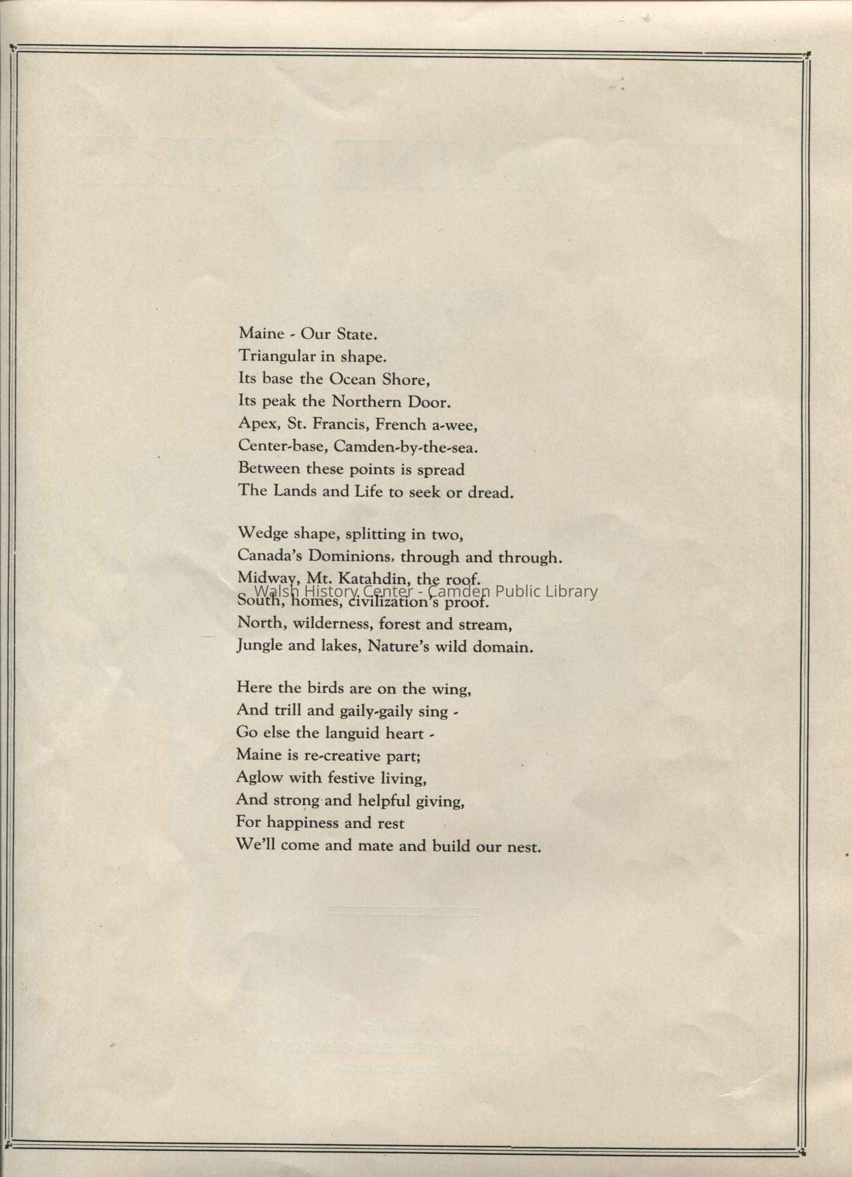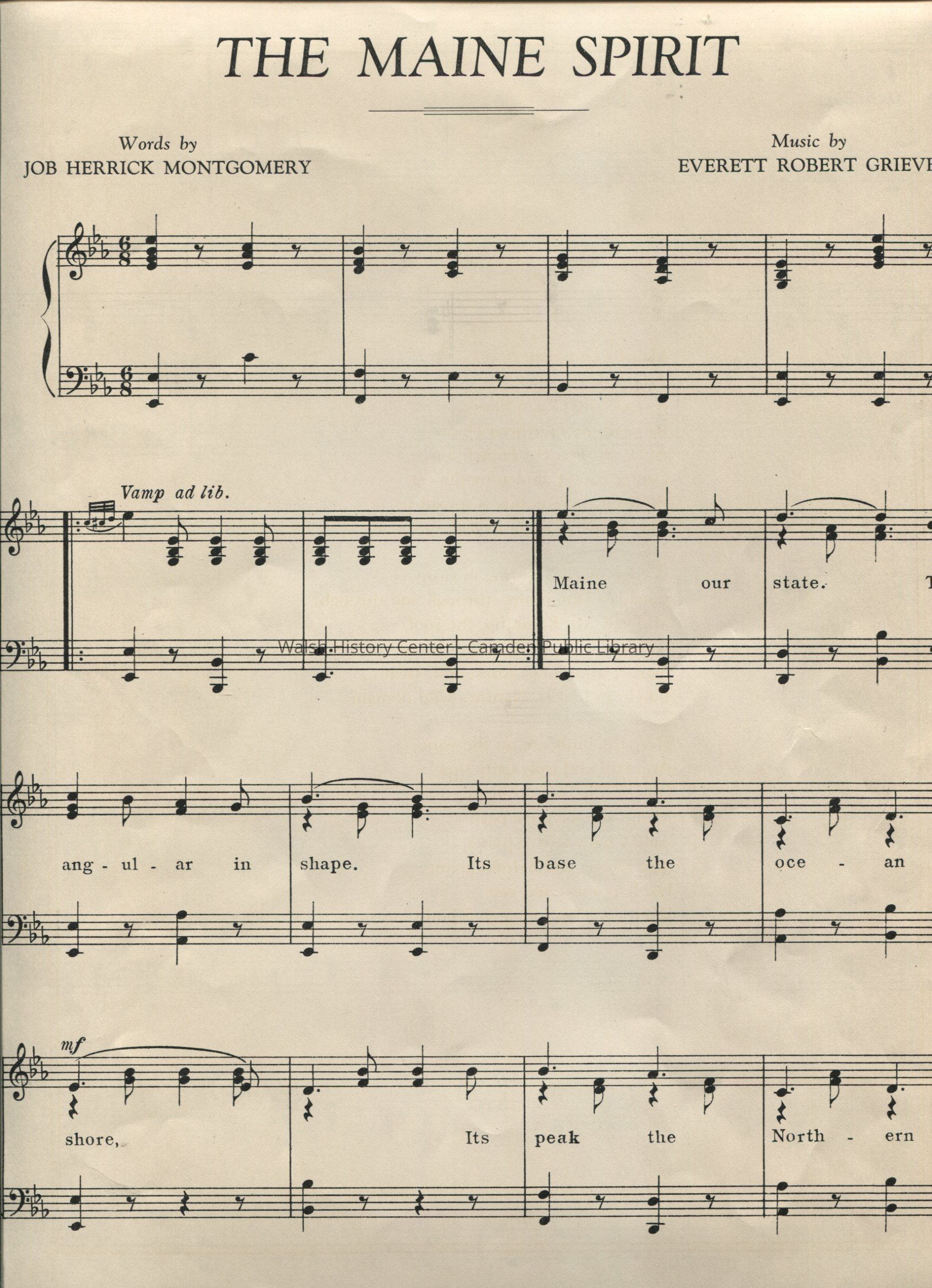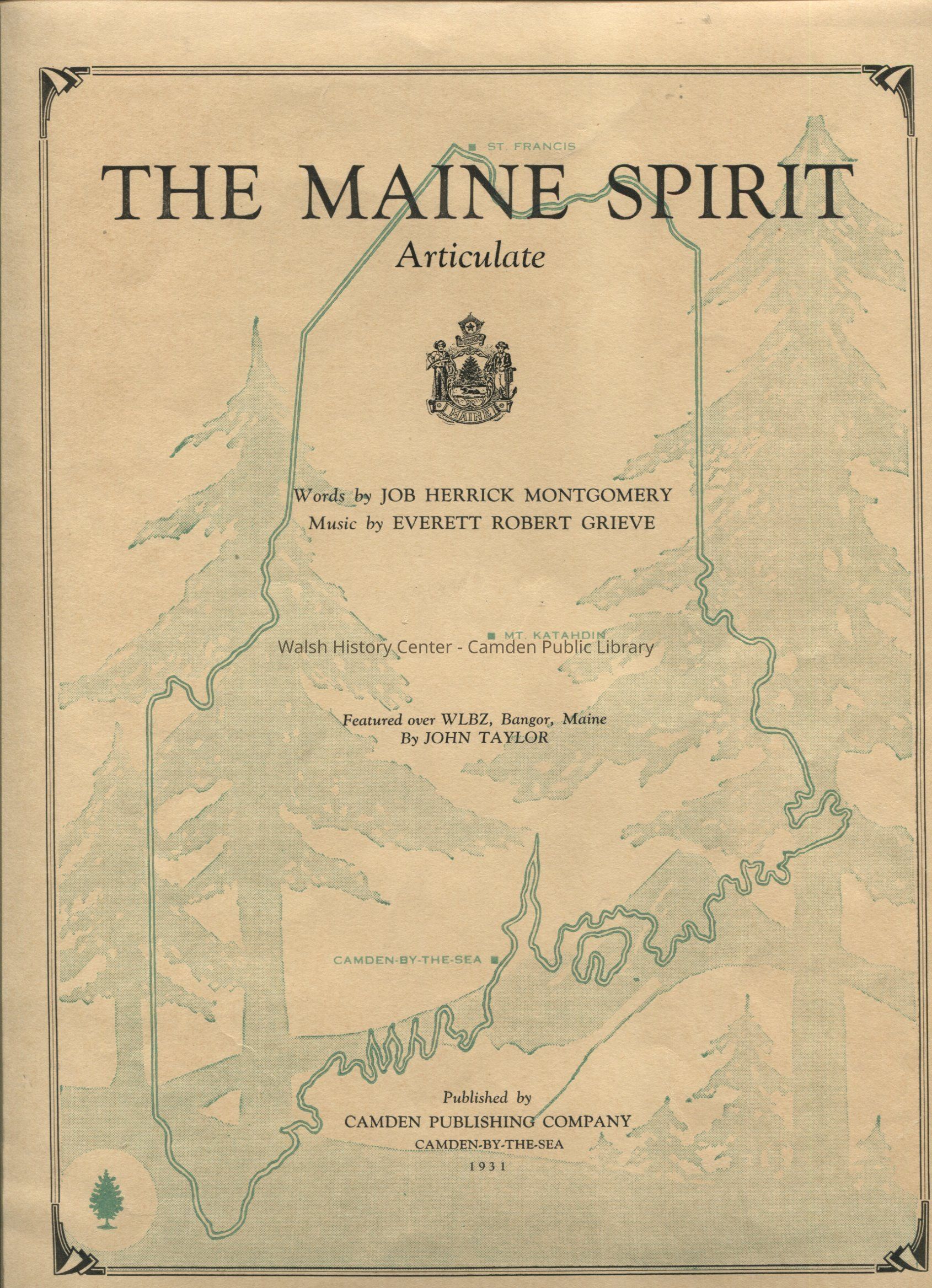 One copy of the "The Maine Spirit Articulate" sheet music written by Job Herrick Montgomery and Everett Robert Grieve. Published by the Camden Publishing Company and featured over WLBZ, Bangor, Maine by John Taylor.Collection