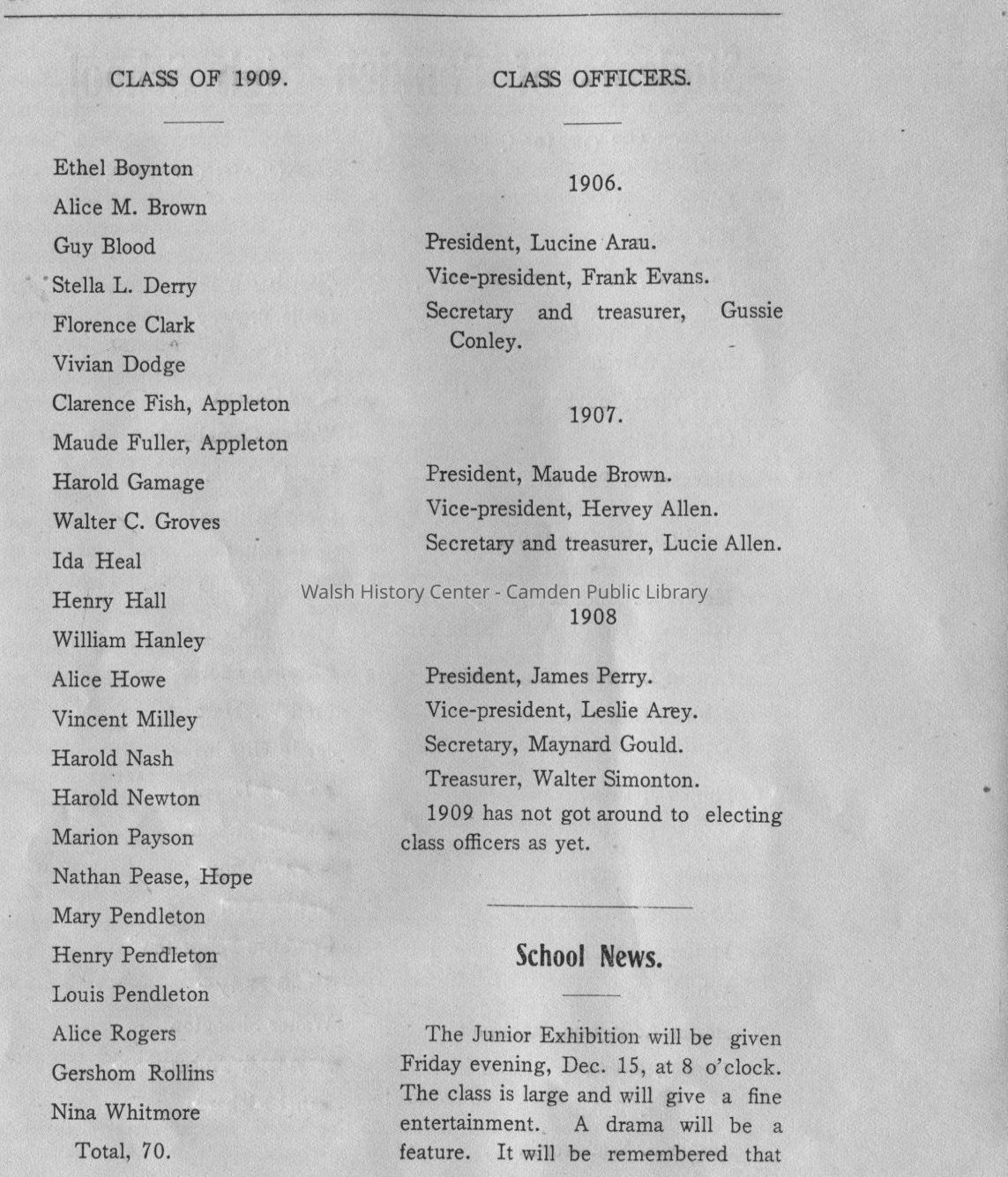 Camden High School publication. December 1905. Vol. 5, No. 1. Includes advertisers, school news, student essays, list of students of Camden High School for Class of 1906, 1907, 1908 and 1909 with class officers.