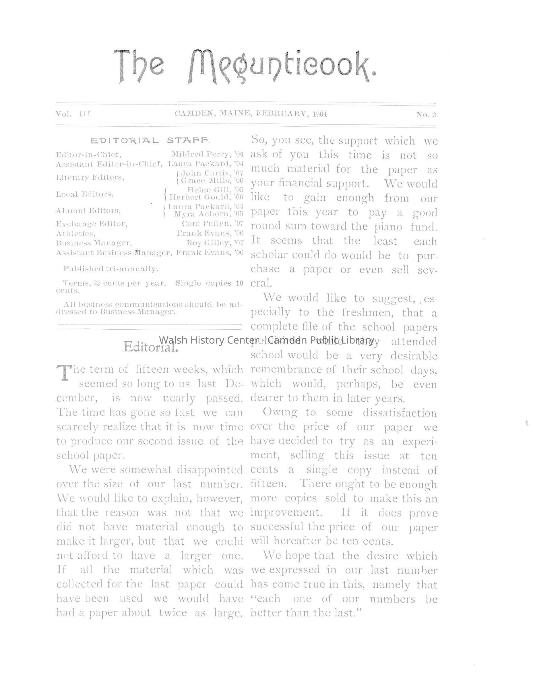 Camden High School publication. February 1904. Vol. III, No. 2. Includes advertisers, alumni notes from classes 1891 - 1898, school news, and student writings.