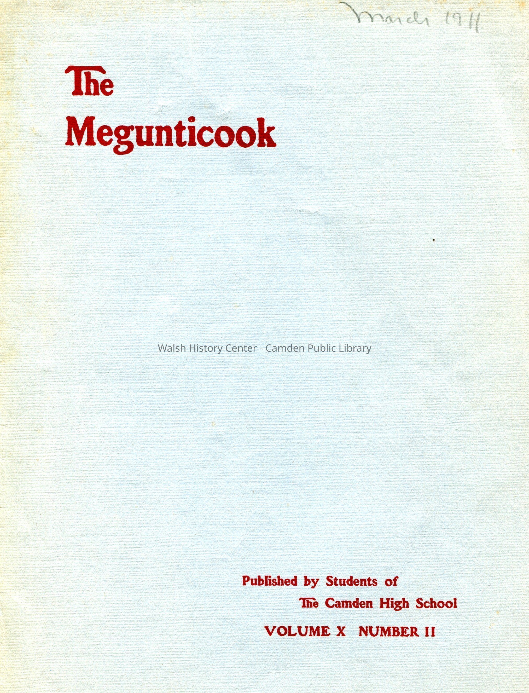 Camden High School publication. March 1911. Vol. 10, No. 2. Includes advertisers, editorials and student articles, alumni notes, and athletics.