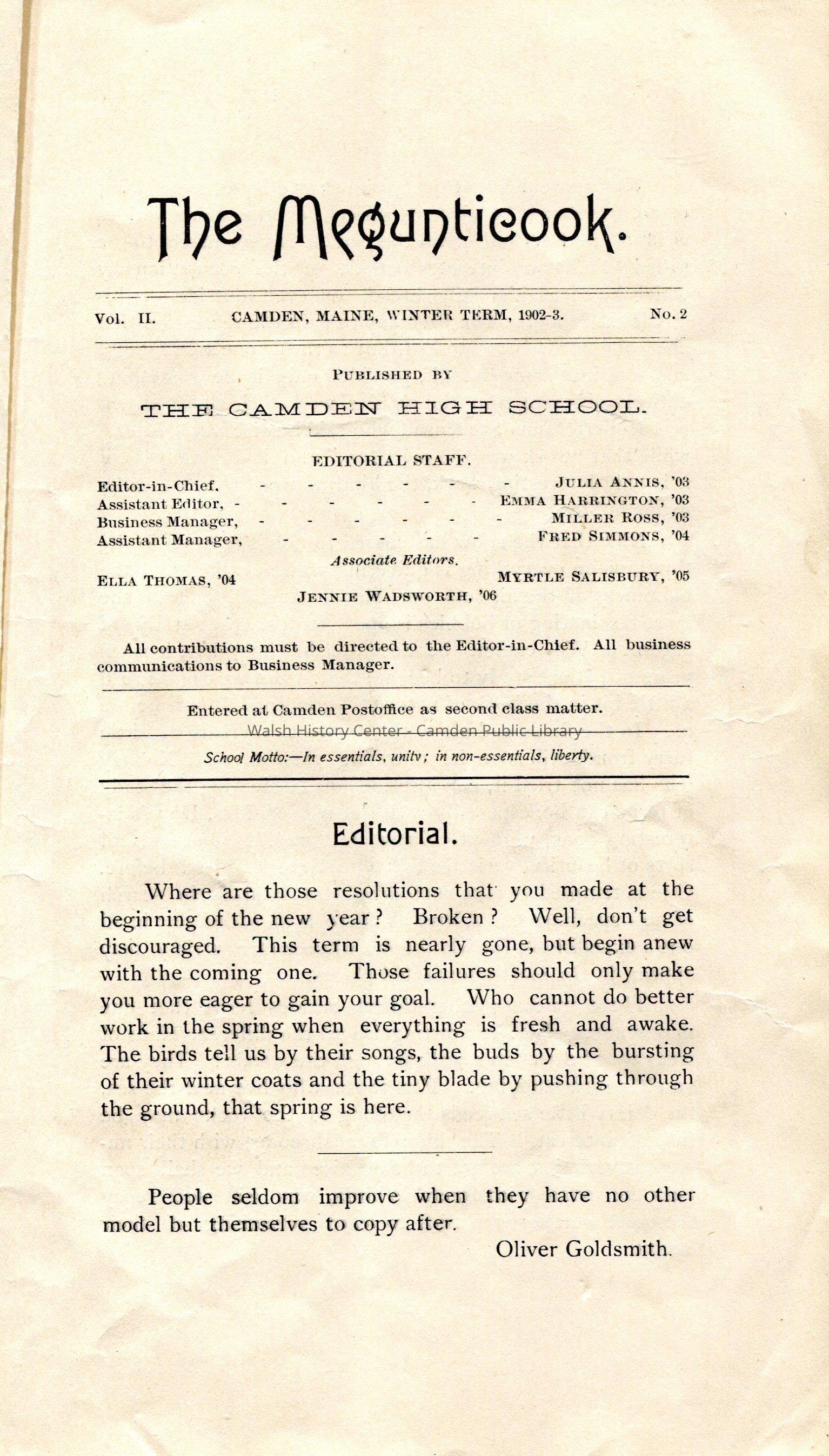 Camden High School monthly publication. Winter term, 1902-3. Vol II. No. 2. Includes advertisers.