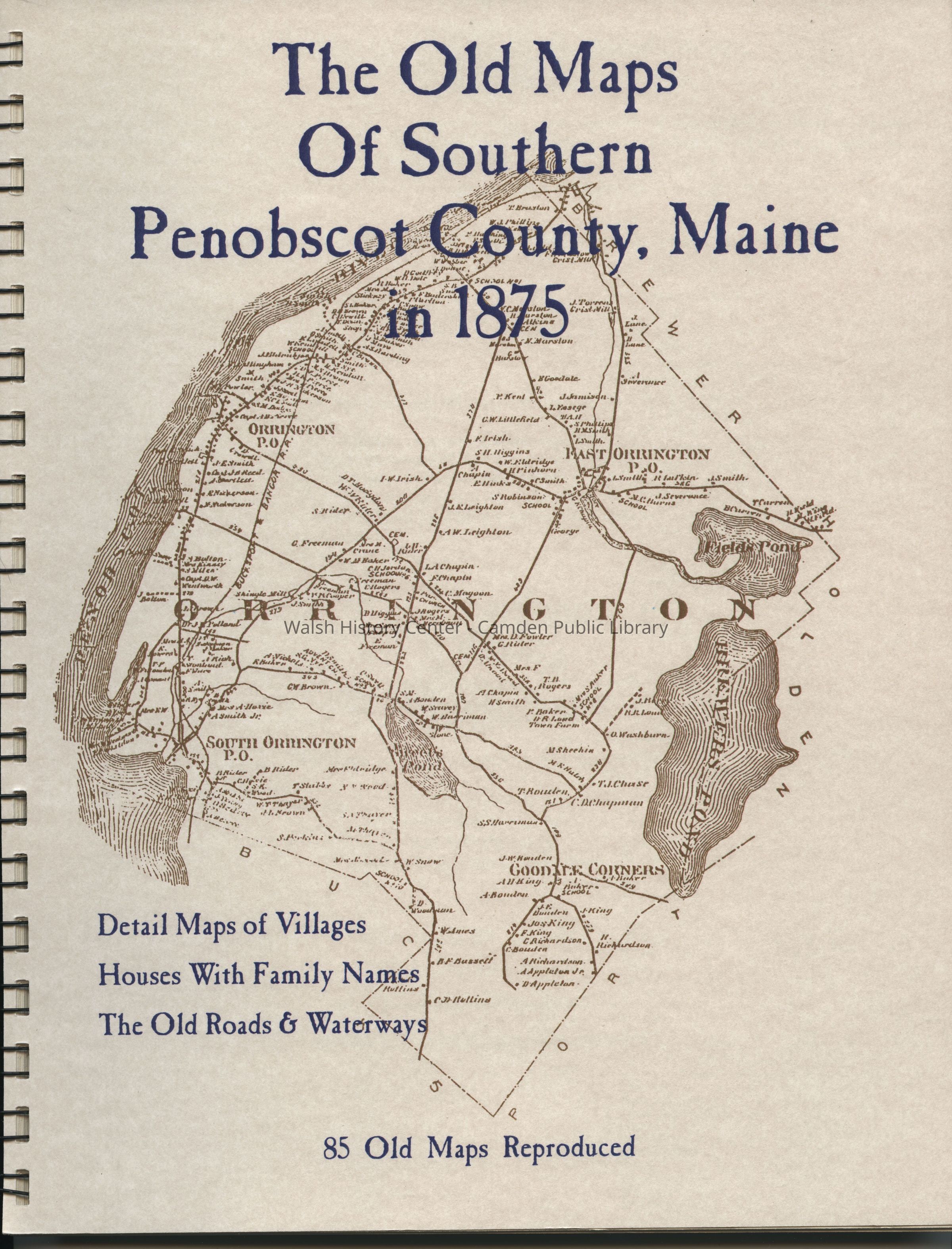 85 reproductions of old maps of Penobscot County, Maine, in 1875. Includes detail maps of villages, houses with family names, and old roads.