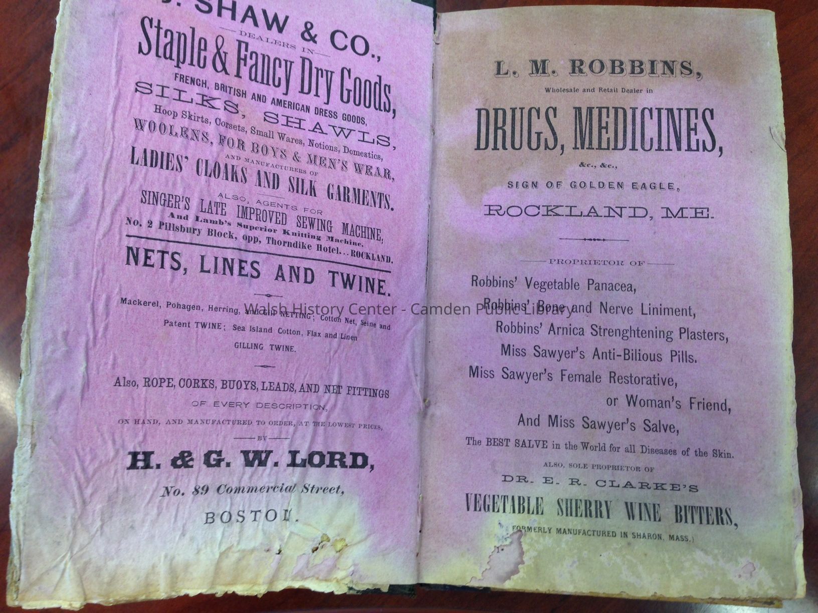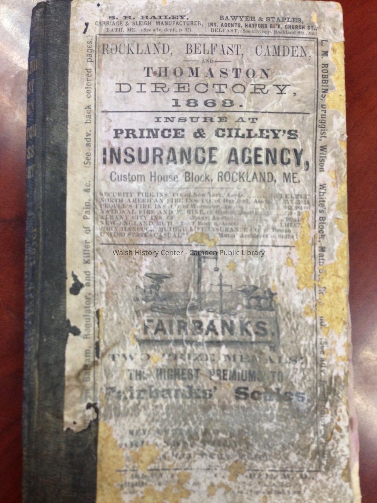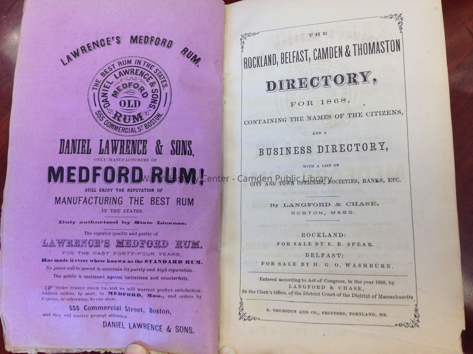 The 1868 Rockland, Belfast, Camden and Thomaston Directory published by Langford & Chase of Boston. Item belonged to Wilder W. Perry (1848-1943), editor and publisher of the Camden Herald newspaper from 1874-1891.