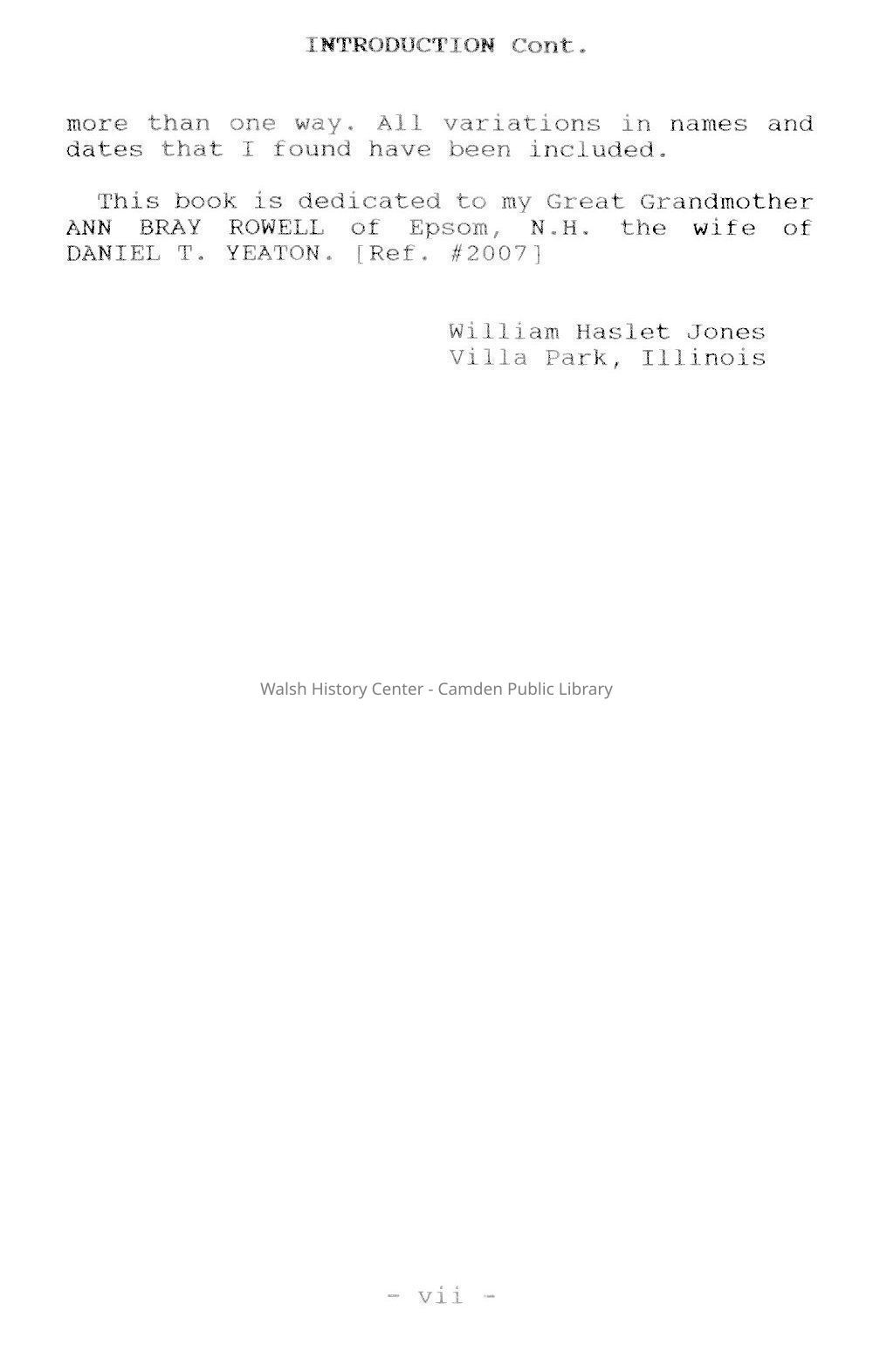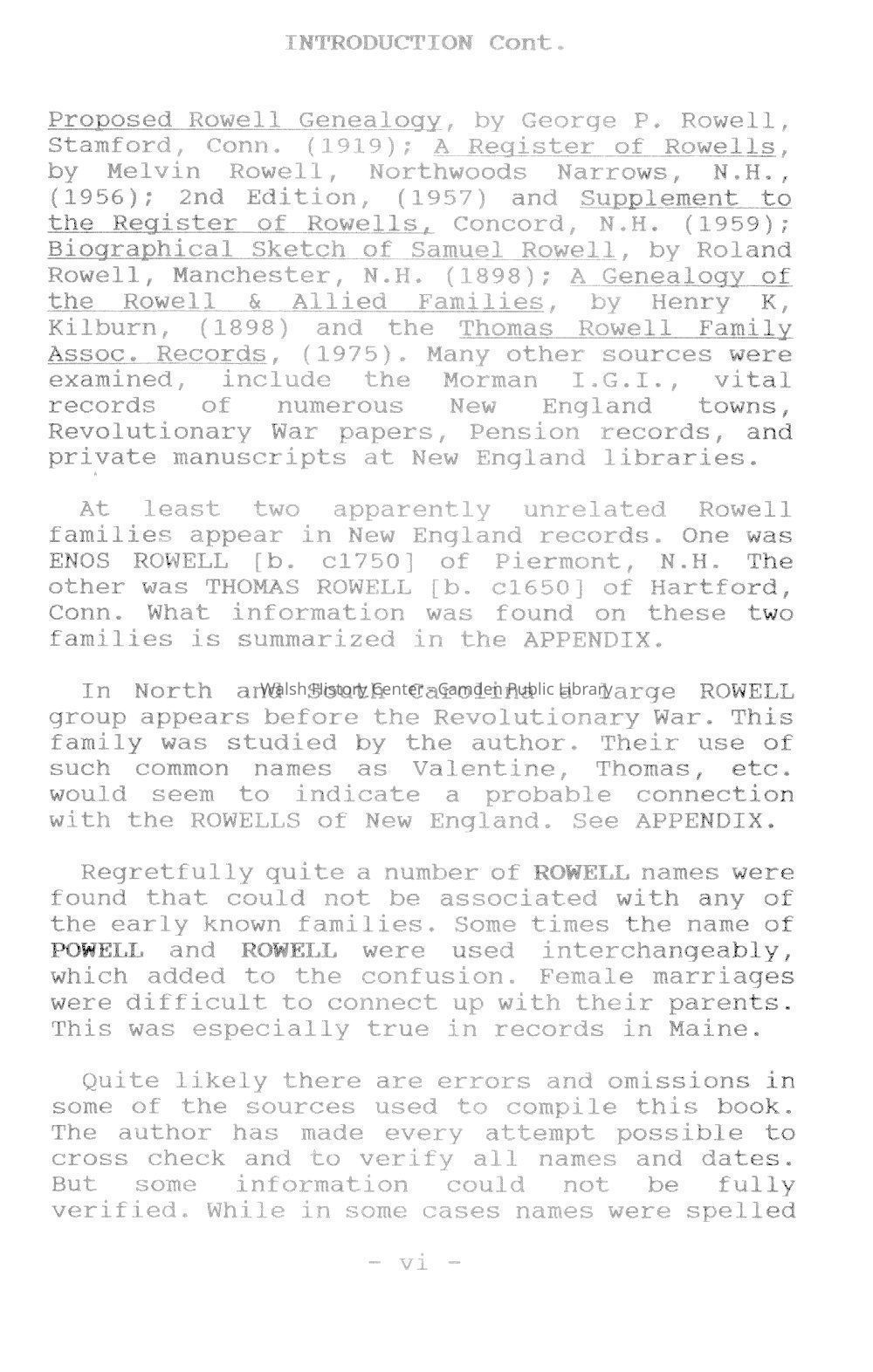 Thomas Rowell and his son Valentine Rowell of Salisbury, Massachusetts were among the orignal proprieters. Their English home was Atherstone, County Warwickshire. Includes English origins as well as New England generations with appendices including Rowell Family members who served in the Revolutionary War, War of 1812, families in Connecticut, New Hampshire, and South Carolina. An everyname index is available.