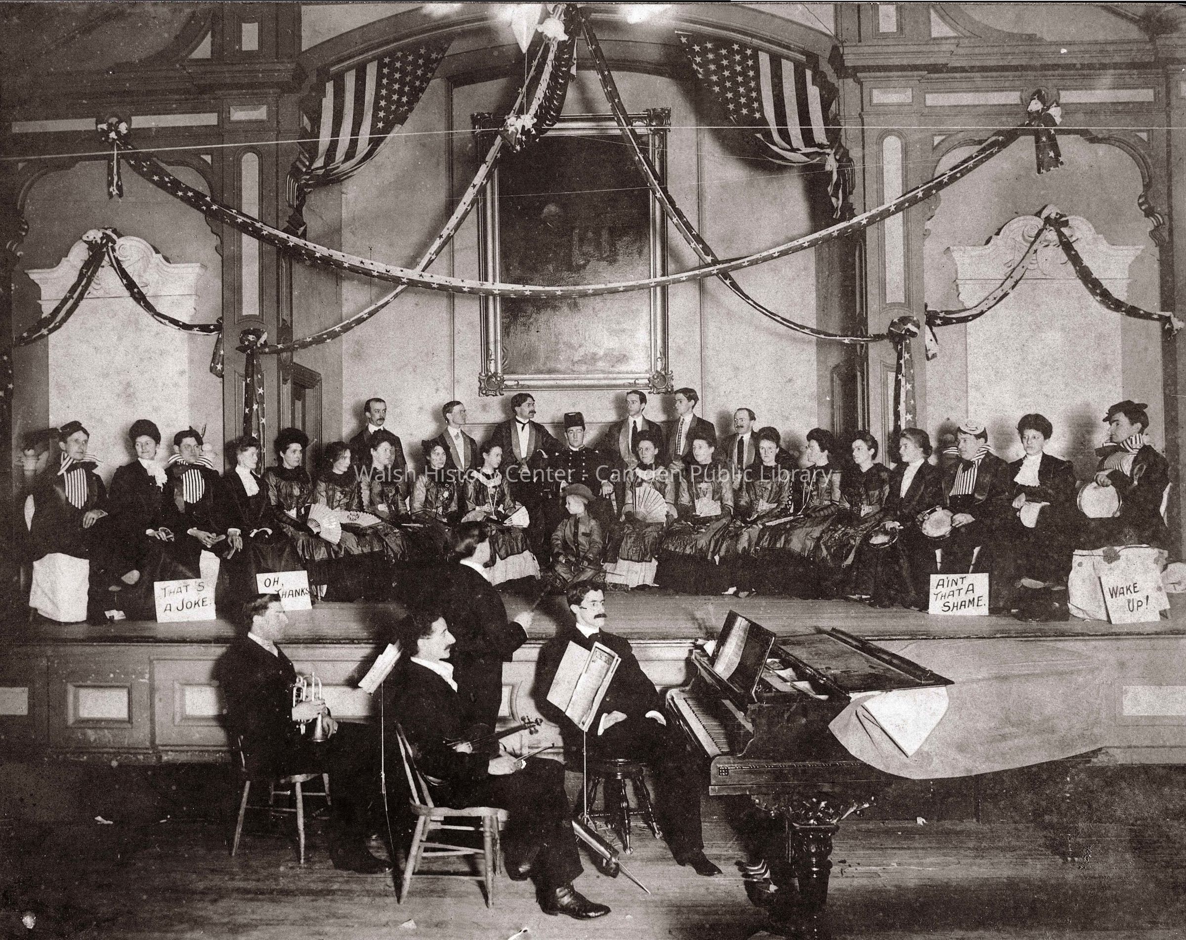 Copy of photograph of three-piece orchestra with conductor in front of a stage of people.Collection