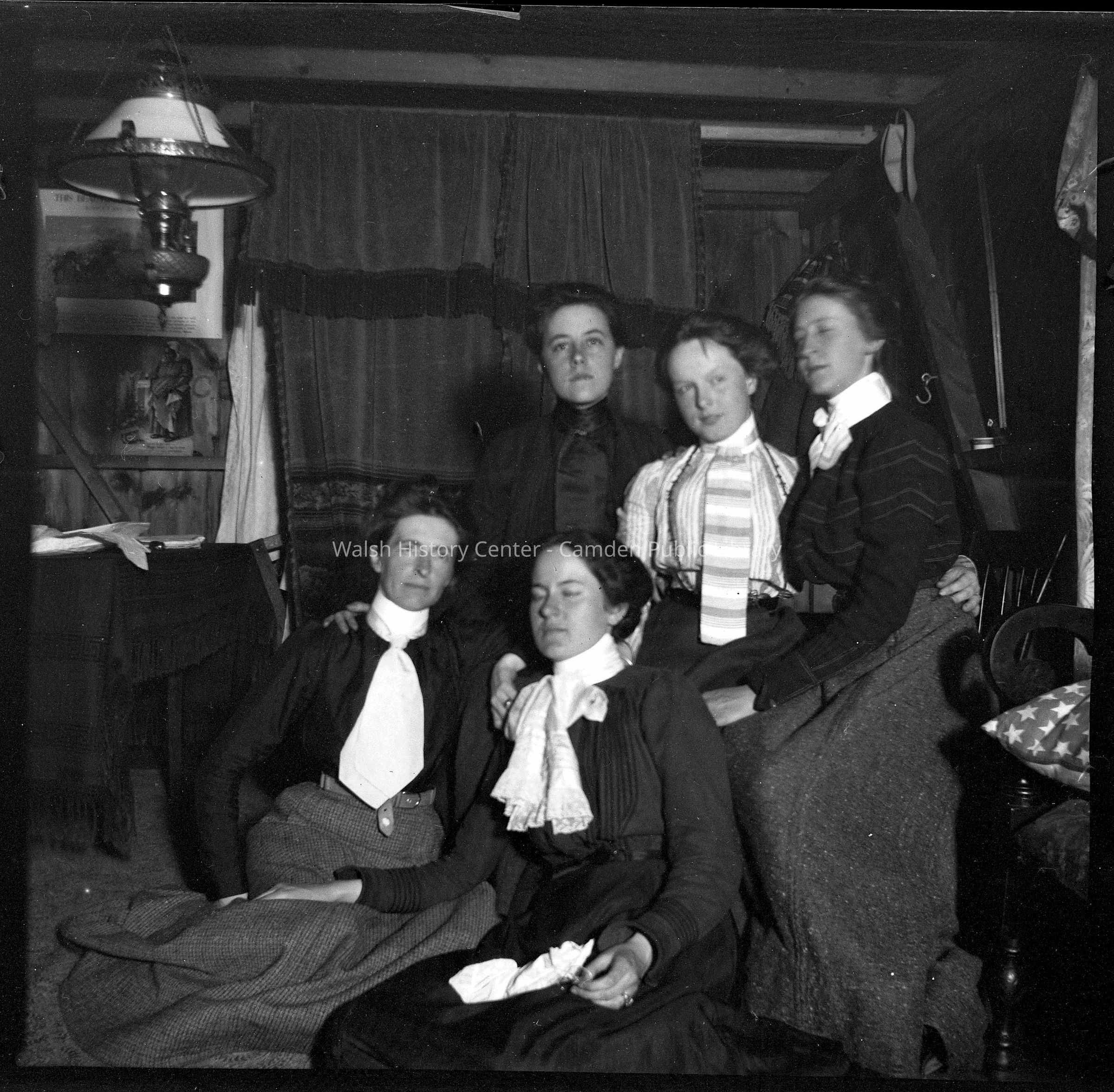 Photograph labeled "Camping crowd at Ogier Point, 1900." Theresa Babb is seated at the far left.Collection