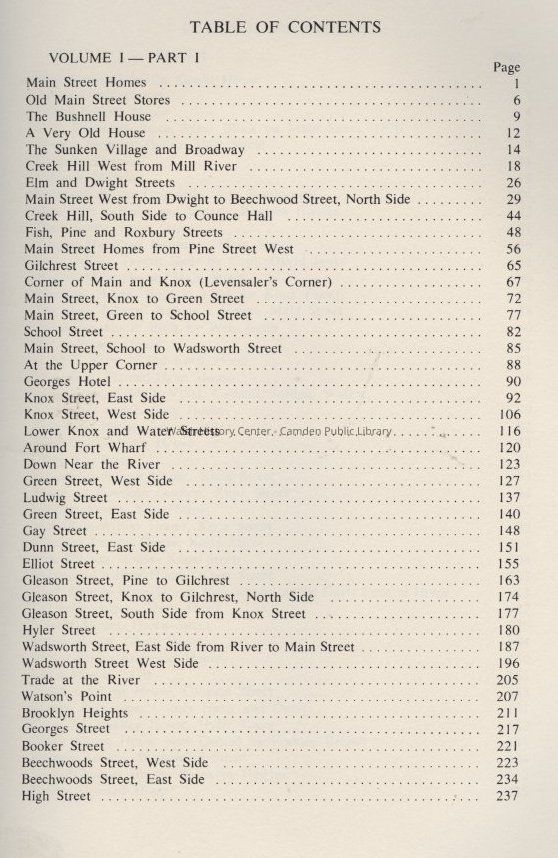 Volume I of a two volume set that narrates the Town of Thomaston, Maine by street, building and resident including histories of lots, buildings, businesses and families from 1860 to the mid-1900's.