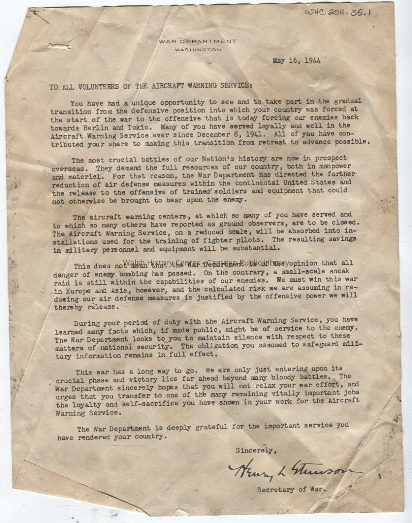 Letter dated May 16, 1944 relating to the discontinuance of the Aircraft Warning Service in order to shift the war effort to an offensive battle overseas. Secretary of War Henry L. Stimson (1867-1950) thanks the volunteers at the local aircraft warning centers for their dedicated service. These were found among Camden resident Harold Corthell's papers, who was a volunteer in the Camden's Aircraft Warning Service. The Aircraft Warning Service (AWS) was a civilian service of the United States Army Ground Observer Corps during World War II to keep watch for enemy planes entering American airspace. It became inactive on May 29, 1944.Collection