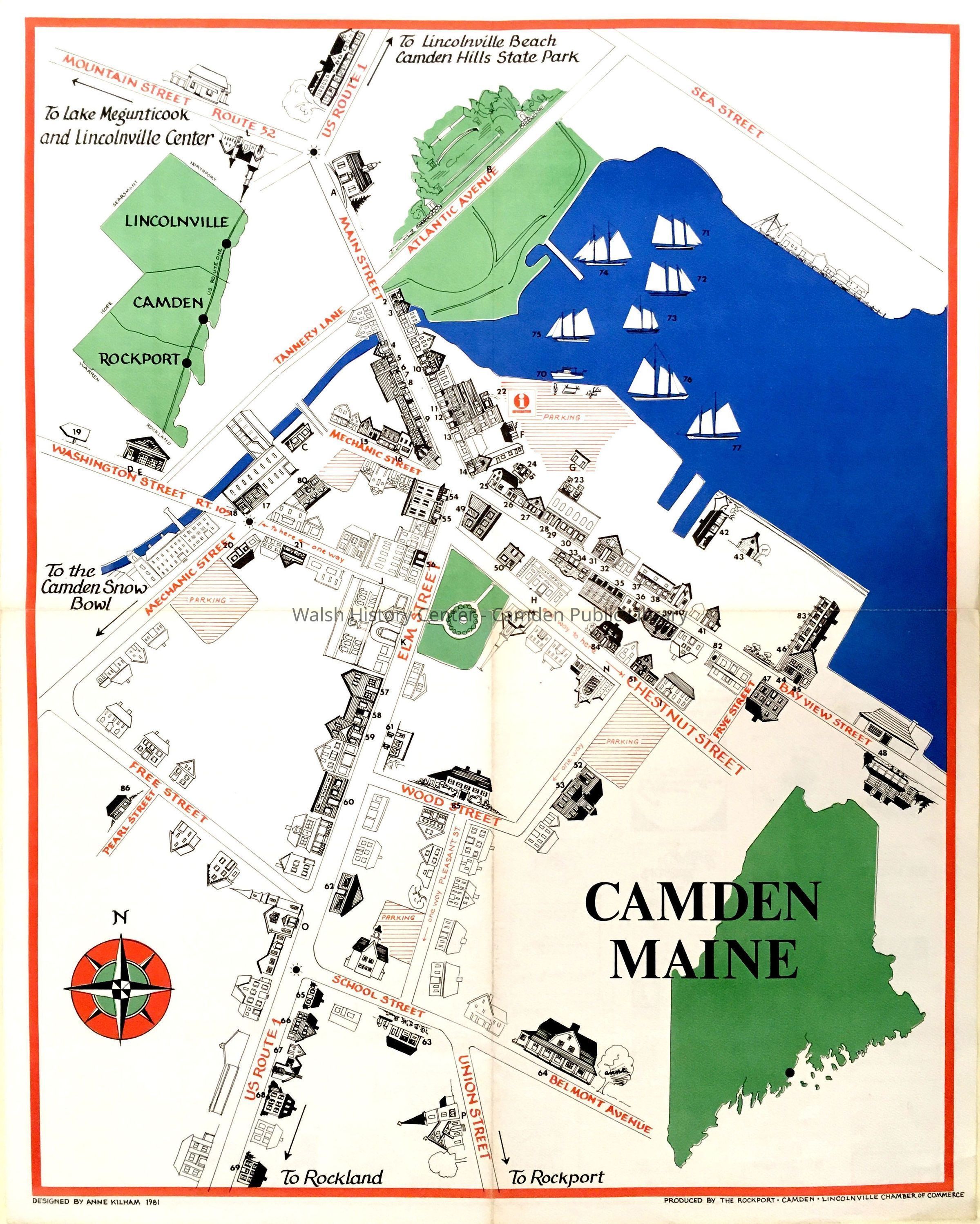 CAMDEN, MAINE Tourist map 1981 of Camden Harbor and village area from Mechanic Street and Free Street and Sea Street and Atlantic Avenue. Sketches of houses and other structures; inset map in green of Maine and another of Rockport, Camden, and Lincolnville. Harbor is blue. Other features and border in red, green, and black. Features in black are numbered, and keyed on reverse side to identify labels and advertisers.