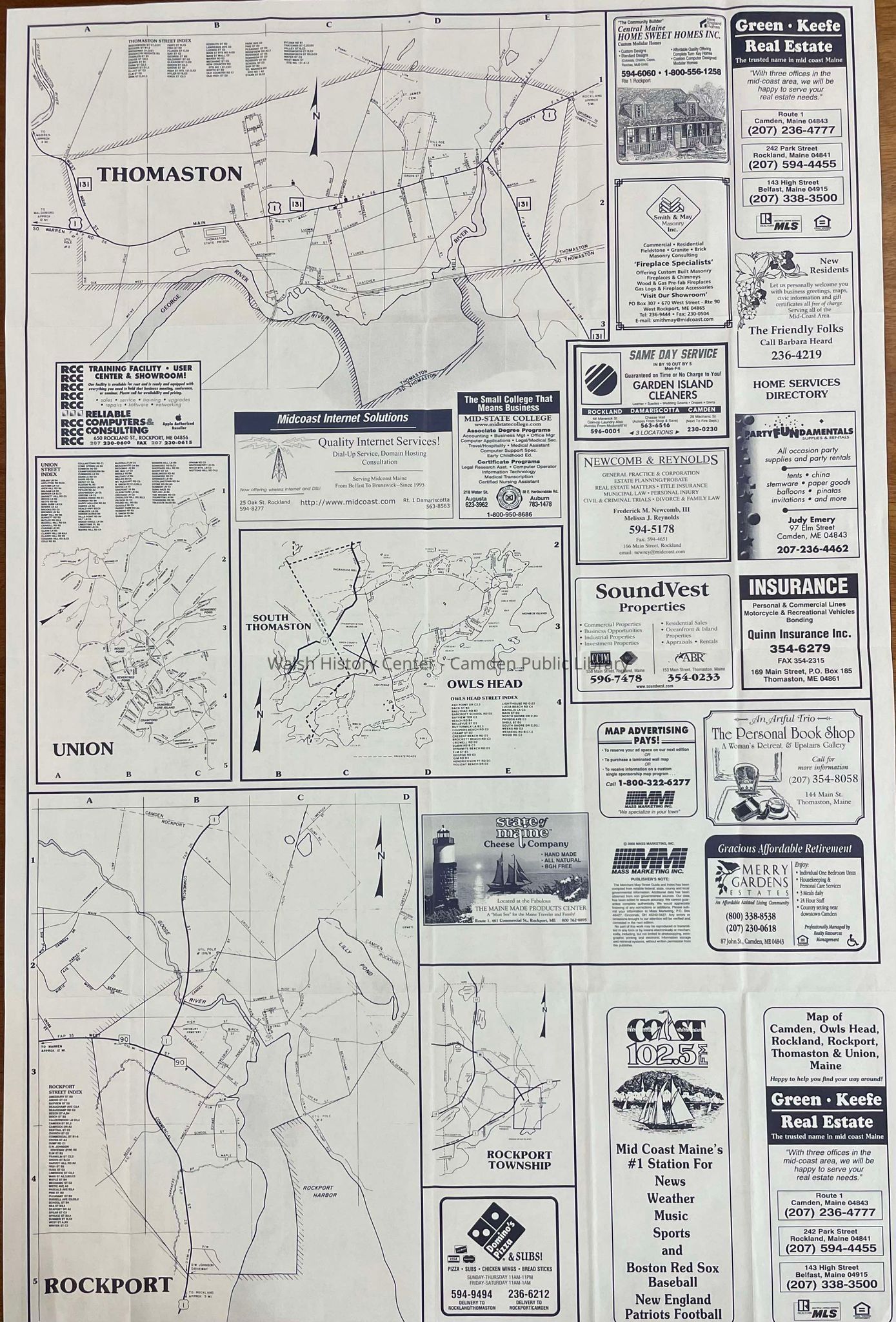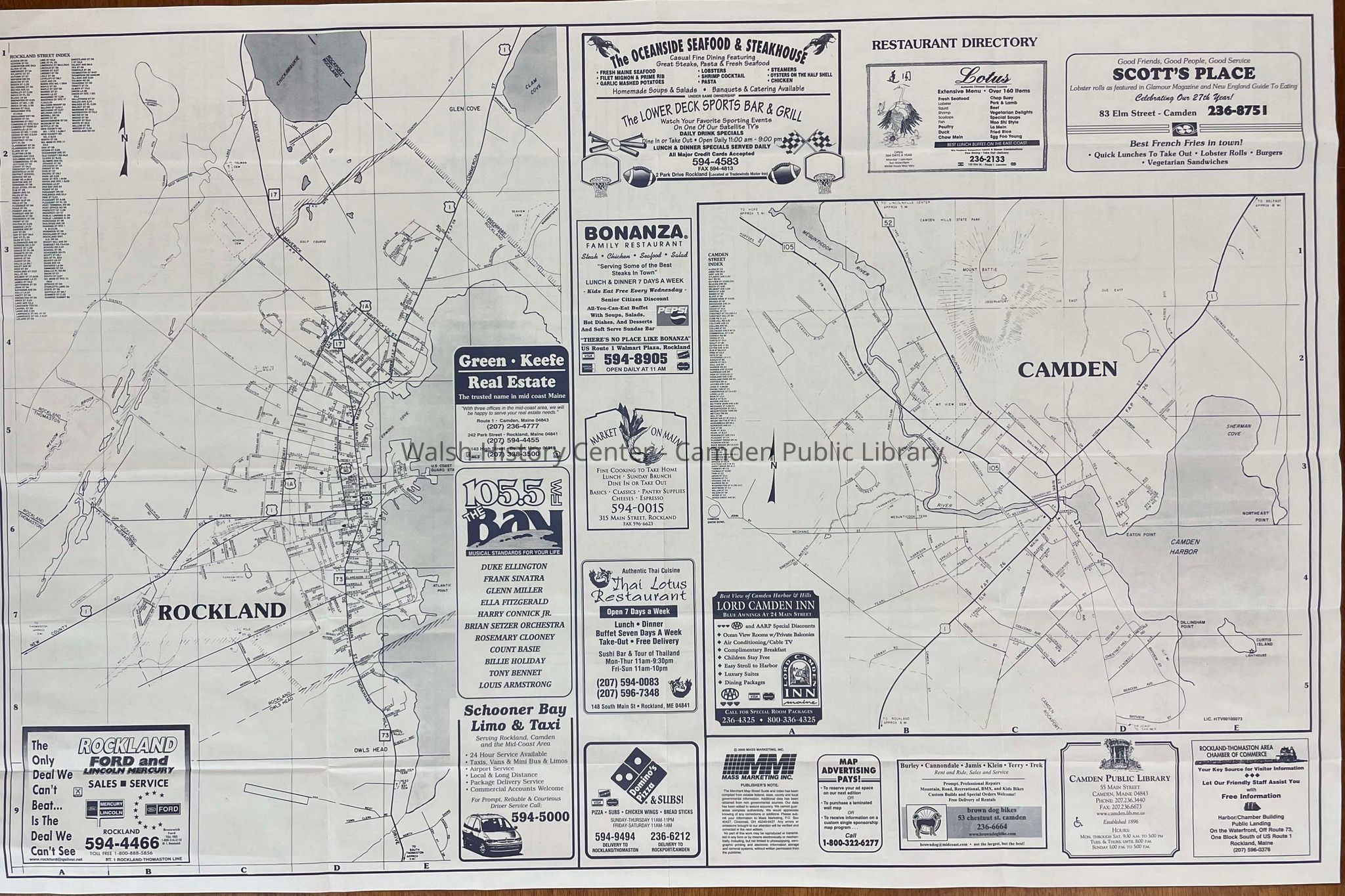 Maps, Camden, Rockland, Rockport, Thomaston, Union, Coast 102.5, Soundvest, Domino's Pizza, Garden Island Cleaners, Merry Gardens, Green Keefe Real Estate, The Personal Book Shop, State of Maine Cheese Company, Bonanza Restaurant, Thai Lotus Restaurant, 105.5 The Bay, Schooner Bay Limo & Taxi, Scott's Place, Market on Main, Lord Camden Inn, Rockland Ford and Lincoln MercuryArchive Details