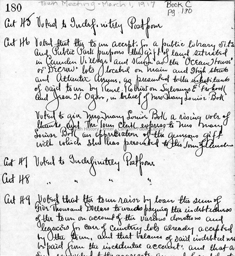 Handwritten report of action taken at town meeting where parcel of land currently occupied by the Camden Public Library was gifted to the town of Camden by Mary Louise Bok - March 1, 1917.