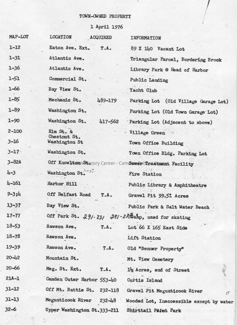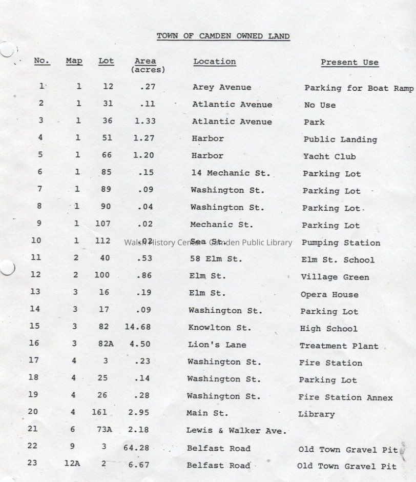 Blue three-ring notebook of materials relating to property owned by the Town of Camden, Maine prepared by Diane Bacon, Town Clerk. The notebook includes a numerical listing of town-owned properties with descriptions, values and deeds.Collection