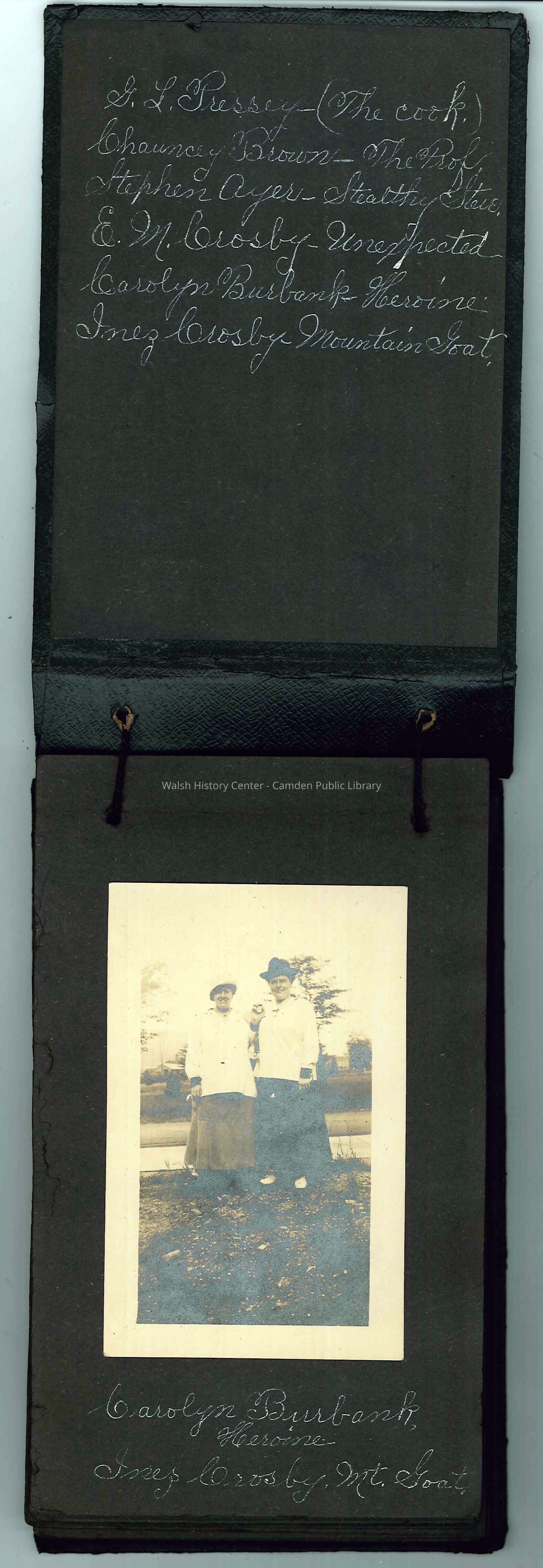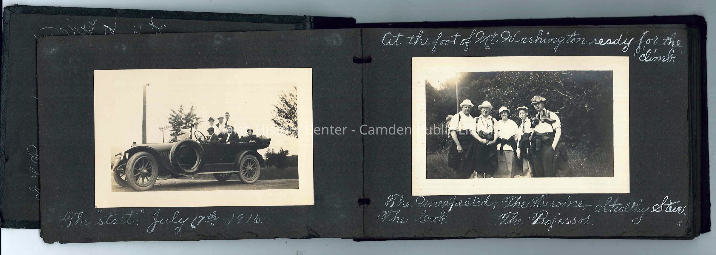 Scrapbook (5" x 8") of the Crosby's trip to Mt. Washington on July 17 & 18, 1916. Friends G.L. Pressey, Chauncey Brown, Stephen Ayer and Carolyn Burbank accompanied the Crosbys on their hike up Mt. Washington via carriage road.Collection