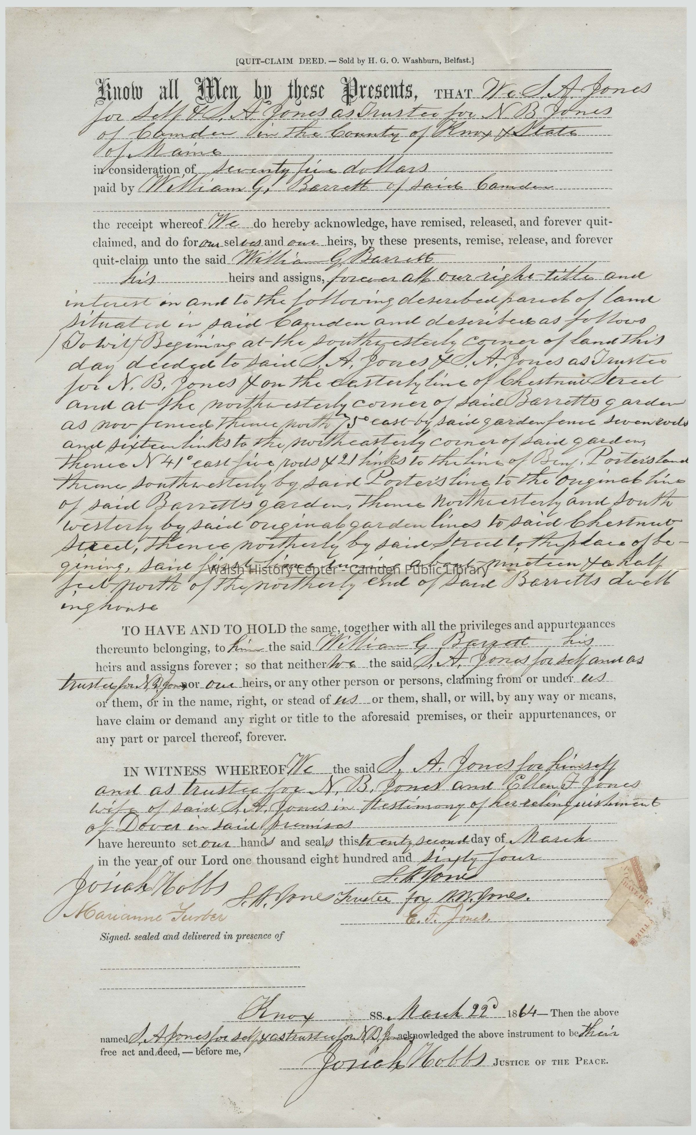 Know all Men by these Presents, that We S.A. Jones for Self & S.A. Jones as Trustee for N. B. Jones of Camden in the County of Knox & State of Maine in consideration of seventy five dollars paid by William G. Barrett of said Camden the receipt whereof we do hereby acknowledge, have remised, released, and forever quit-claimed, and do for our selves and our heirs, by these presents, remise, release, and forever quit-claim unto the said William G. Barrett his heirs and assigns, forever all our rights-title and interest in and to the following described parcel of land situated in said Camden and described as follows To wit Beginning at the southeasterly corner of land this day decided to said S.A. Jones & S.A. Jones as Trustee for N.B. Jones & on the easterly line of Chestnut Street and at the northwesterly corner of said Barrett's garden as now fenced thence north by 5°east by said garden fence seven rods and sixteen links to the northeasterly corner of said garden, thence N 41° east five rods &21 links to the line of Benj. Porter's land, thence southeasterly by said Porter's line to the original line of said Barrett's garden, thence northeasterly and south westerly by said original garden lines to said Chestnut Street, thence northerly by said Street to the place of beginning, said first line running about nineteen & a half feet north of the northerly end of said Barretts dwelling house.
