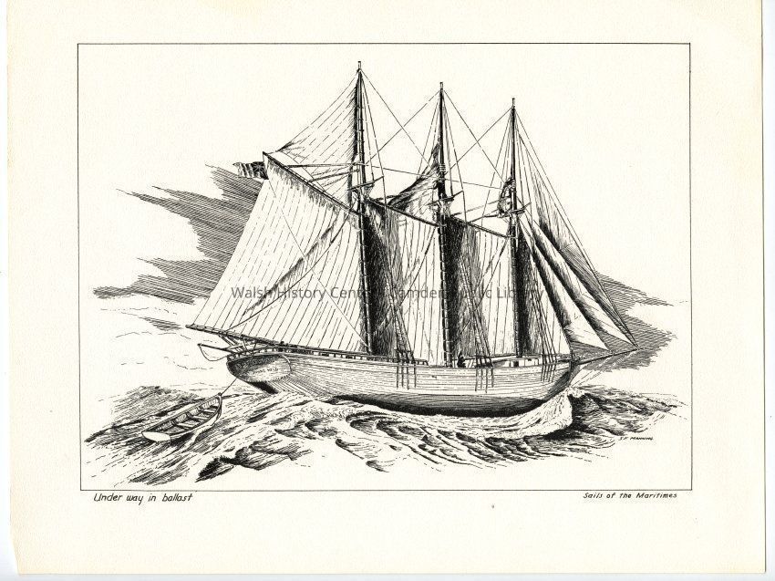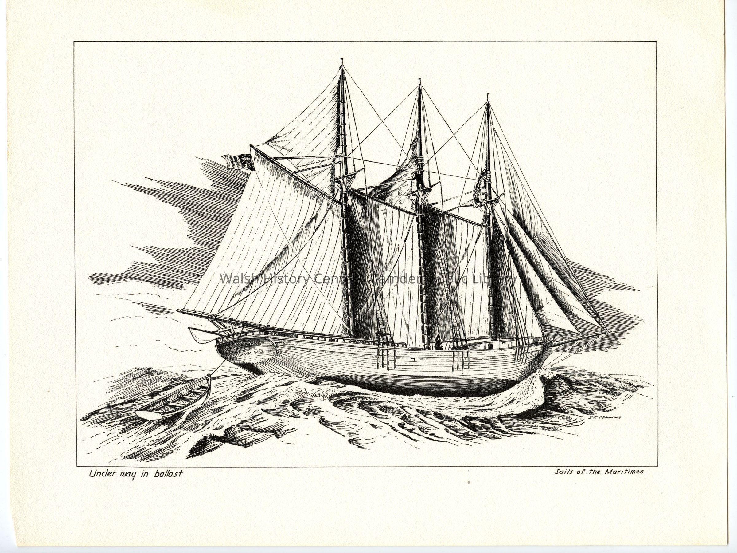 Pen and ink drawing of a schooner under sail titled "Under Way in Ballast" by marine illustrator Samuel F. Manning.Collection