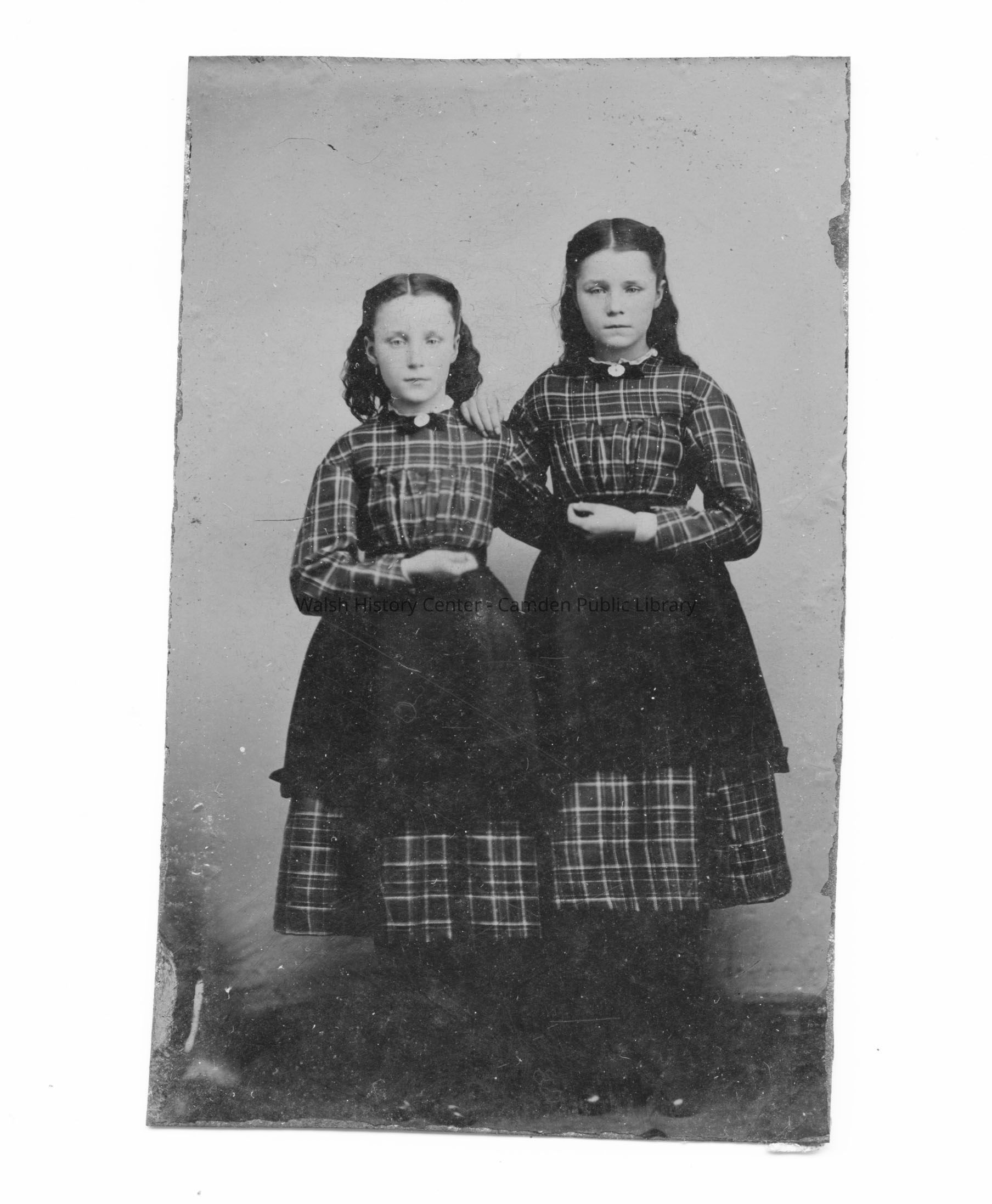 A tintype showing two girls, posing with their arms around each other. They wear matching dresses and dark aprons, and matching pins at their collars. Their hair is loose, pinned up at the sides, and their skirts are about ankle-length. The girls appear to be posed in front of a sheet hung up for a backdrop.