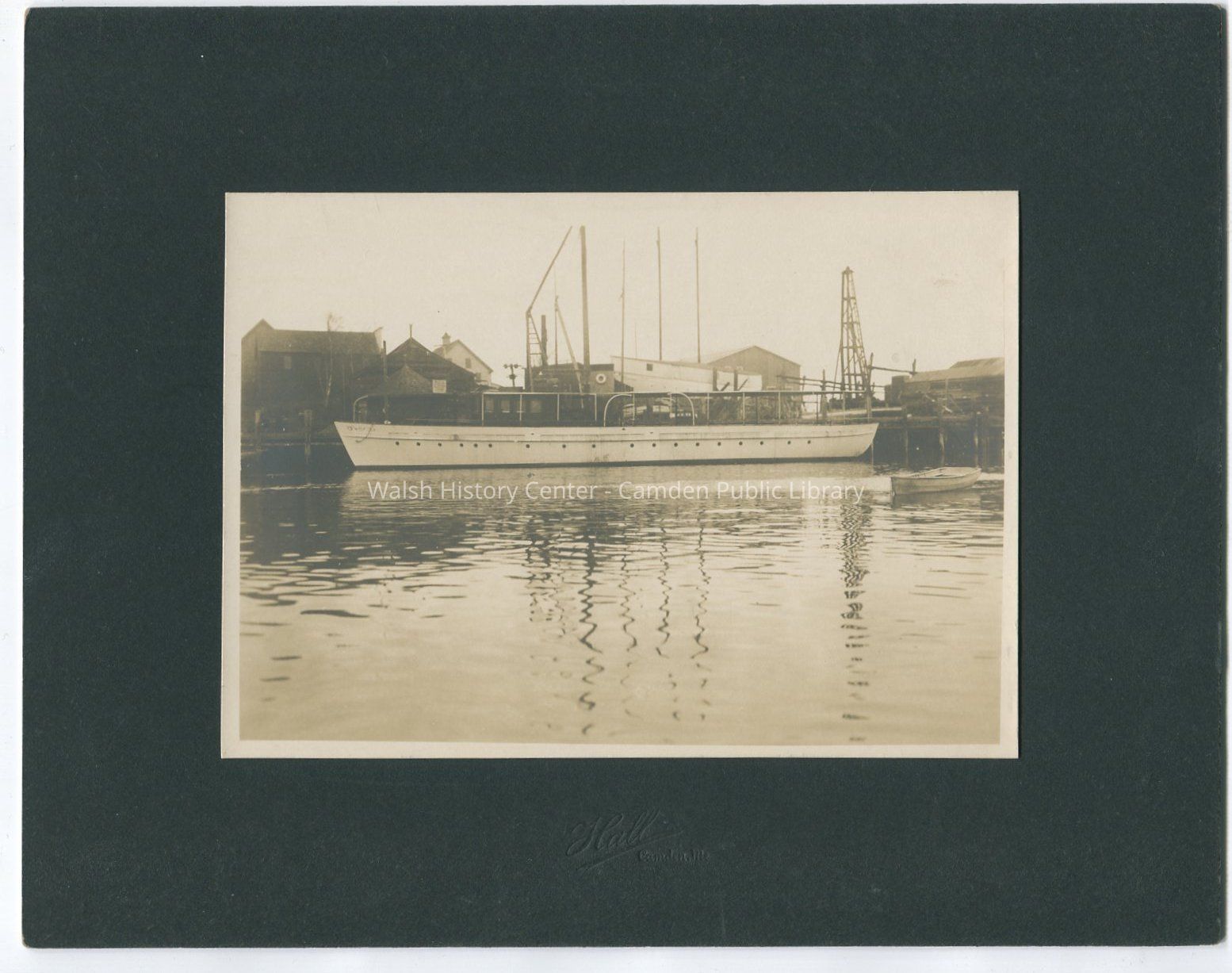 Photograph of an unidentified yacht docked at the Camden Yacht Building & Railway Company, with a white dory in the foreground. Photo is mounted on black matting.Collection