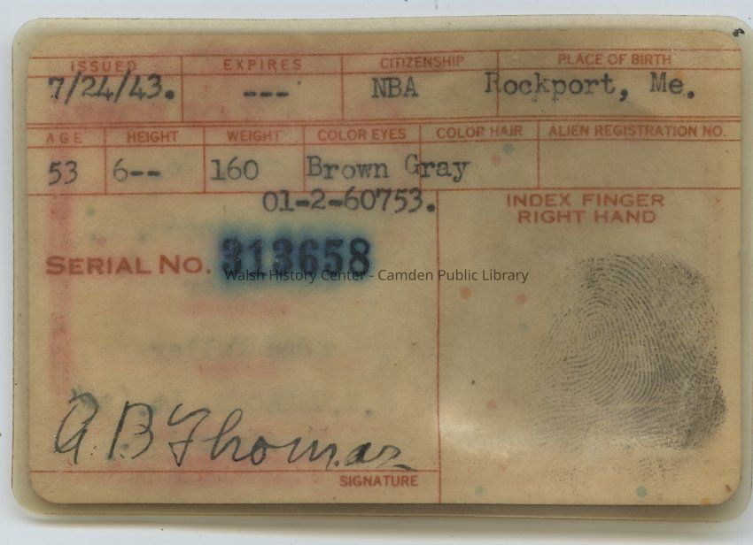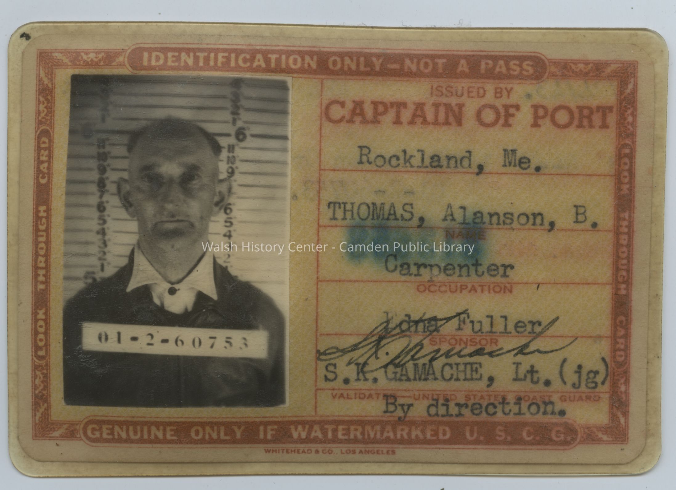Identification card issued by the Coast Guard Captain of the Port of Rockland, Maine, to Alanson B. Thomas. The card lists his occupation as carpenter and includes a photograph and a fingerprint. Thomas's sponsor was Edna Fuller, and Lt. S.K. Gamache signed the validation line.Collection