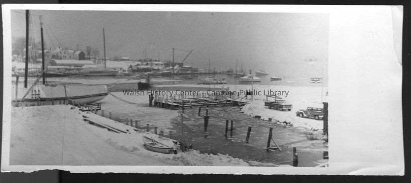 Black and white photograph of the view across Camden Harbor in winter from Willey's Wharf and Sharp's Wharf. Wayfarer Marine is visible in the background.Collection