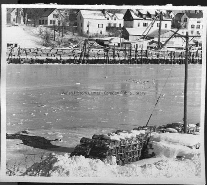 Black and white photograph of the view across Camden Harbor to Sea Street and Wayfarer Marine as seen from the Public Landing. Shows lobster pots and Wayfarer wharf.Collection