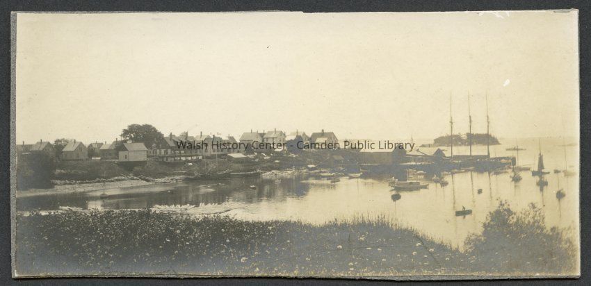 One 2 x 5" photograph of Camden harbor. Image was taken near Megunticook River waterfall. Visible are houses along Sea Street, Camden shipyard, and Negro Island (renamed Curtis Island in 1934).Collection