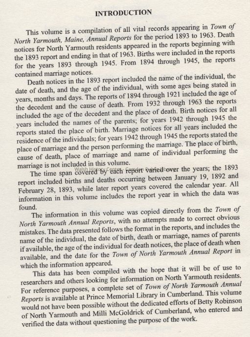 A one volume compilation of the vital records of North Yarmouth, Maine as taken from the Town Reports from 1893 to 1963. The entries are arranged alphabetically by surname. Marriage records include the surname of the bride as well as that of the groom. The records are copied directly from the town reports for that time period.