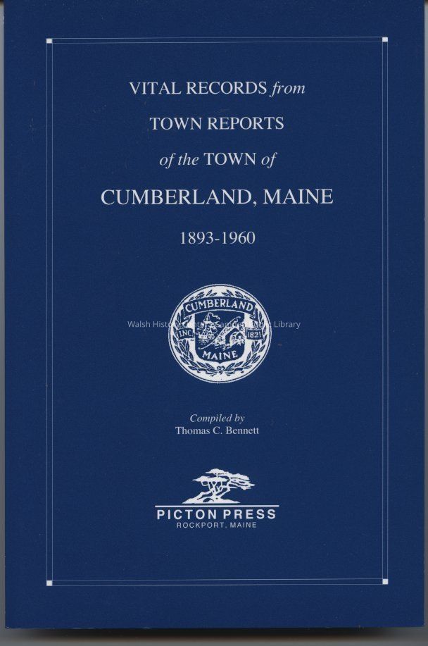 Compilation of the vital records for the town of Cumberland, Maine as taken from the town reports 1893 to 1960. Marriage records include an alphabetical listing by the surname of the bride as well as the groom.