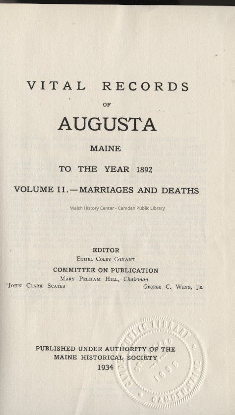 A two-volume collection of the vital records of Augusta, Maine to the year 1892 published under the auspices of the Maine Historical Society. Volume 1 contains births and marriages (A-to MC) and Volume 2 contains marriages (MC-Z) and death records. Listings are in alphabetical order, taken from church records, church registers, records of clergymen, family Bibles, public records and other available sources.