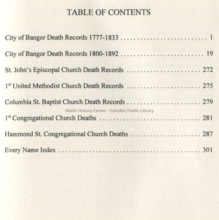 Maine, Bangor, Hammond Street Congregational Church, First Congregational Church (Bangor), Columbia Street Baptist Church, First United Methodist Church, St. John's Episcopal Church, Deaths, Genealogy, IndexOther Names and Numbers