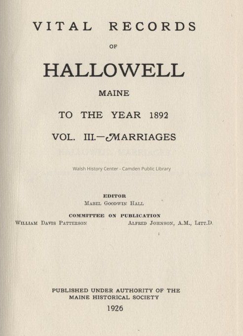 Vital records of Hallowell Maine to the year 1892. Vol. 3 - Marriages.Entry/Object ID