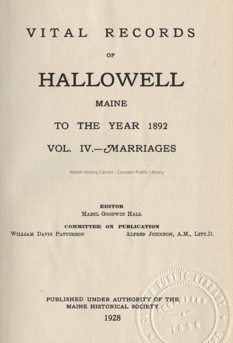 Vital Records of Hallowell, Maine to the year 1892. Volume 4 - Marriages.Entry/Object ID