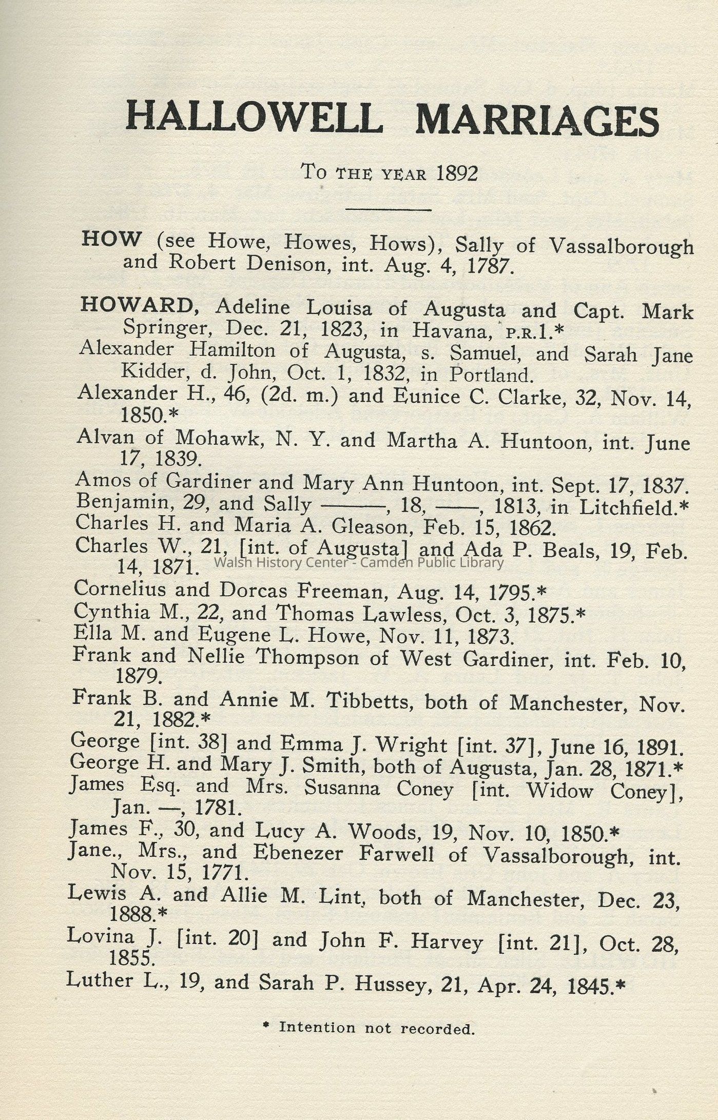 Vital Records of Hallowell, Maine to the year 1892. Volume 4 - Marriages.Entry/Object ID