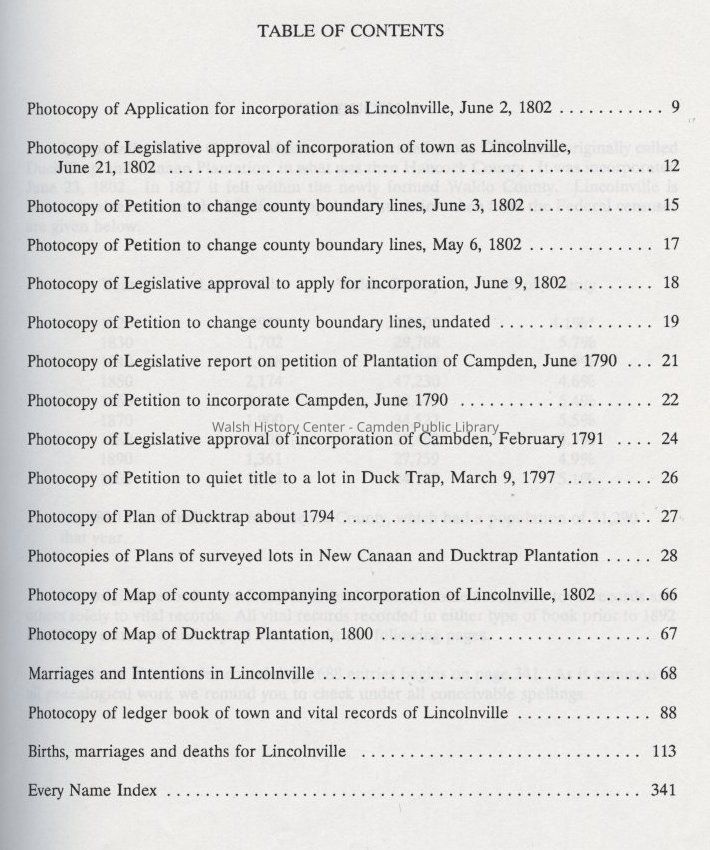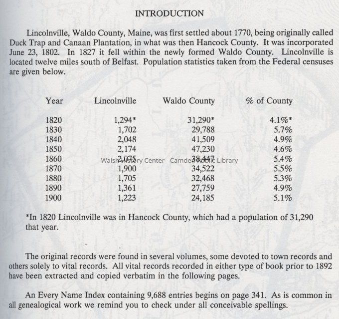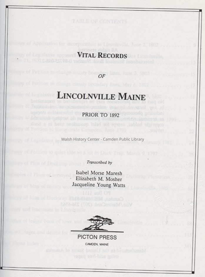 Transcription of vital records of Lincolnville, Maine prior to 1892. Includes maps and photocopied original records.