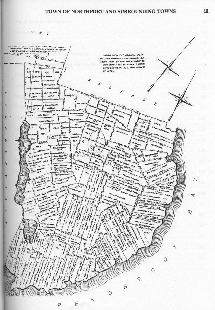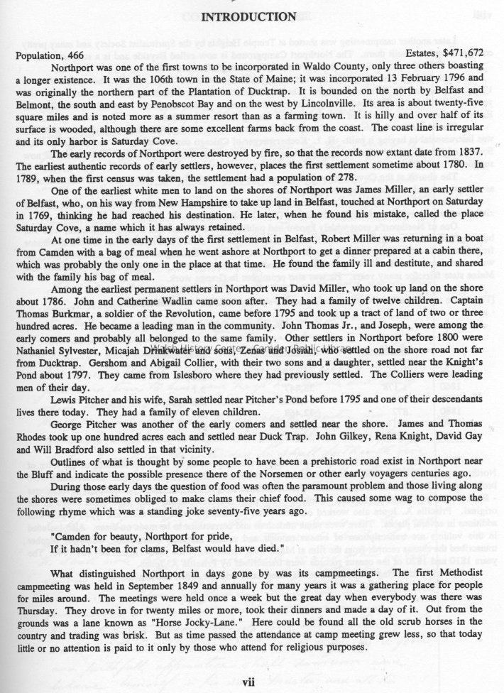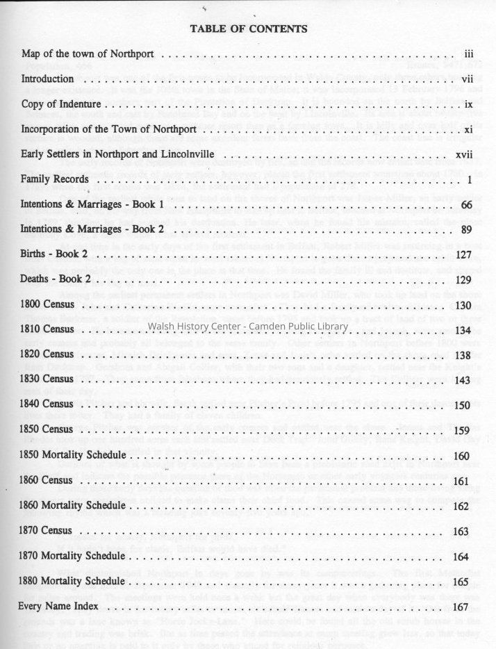 Transcription of original town vital records of Northport, Waldo County, Maine prior to 1892, including Family Records (Book 1), Intentions & Marriages (Books 1 & 2), Births (Book 2), Deaths (Book 2). Also includes transcriptions of census records 1800-1840 and census mortality schedules.