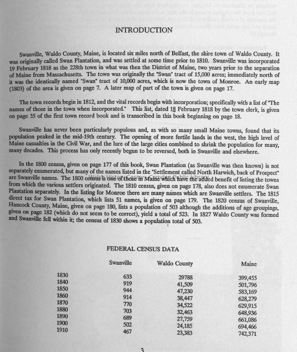 A compilation of the records of the births, marriages and deaths in Swanville prior to 1892, copied from microfilm in the Maine State Arhives and from the original record books kept in the town office. Census records are also included. An every name index is located on page 195 and two early maps of the town are included as well.