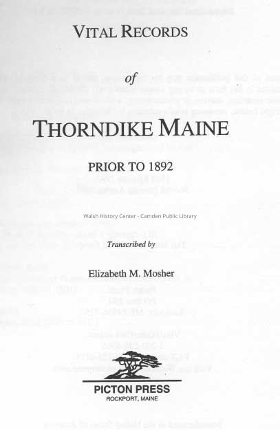 Vital records from approximately 1821 through 1891 for the town of Thorndike (Waldo County), Maine, which was originally called Lincoln Plantation (Hancock County). Includes an every name index with 6,172 entries.