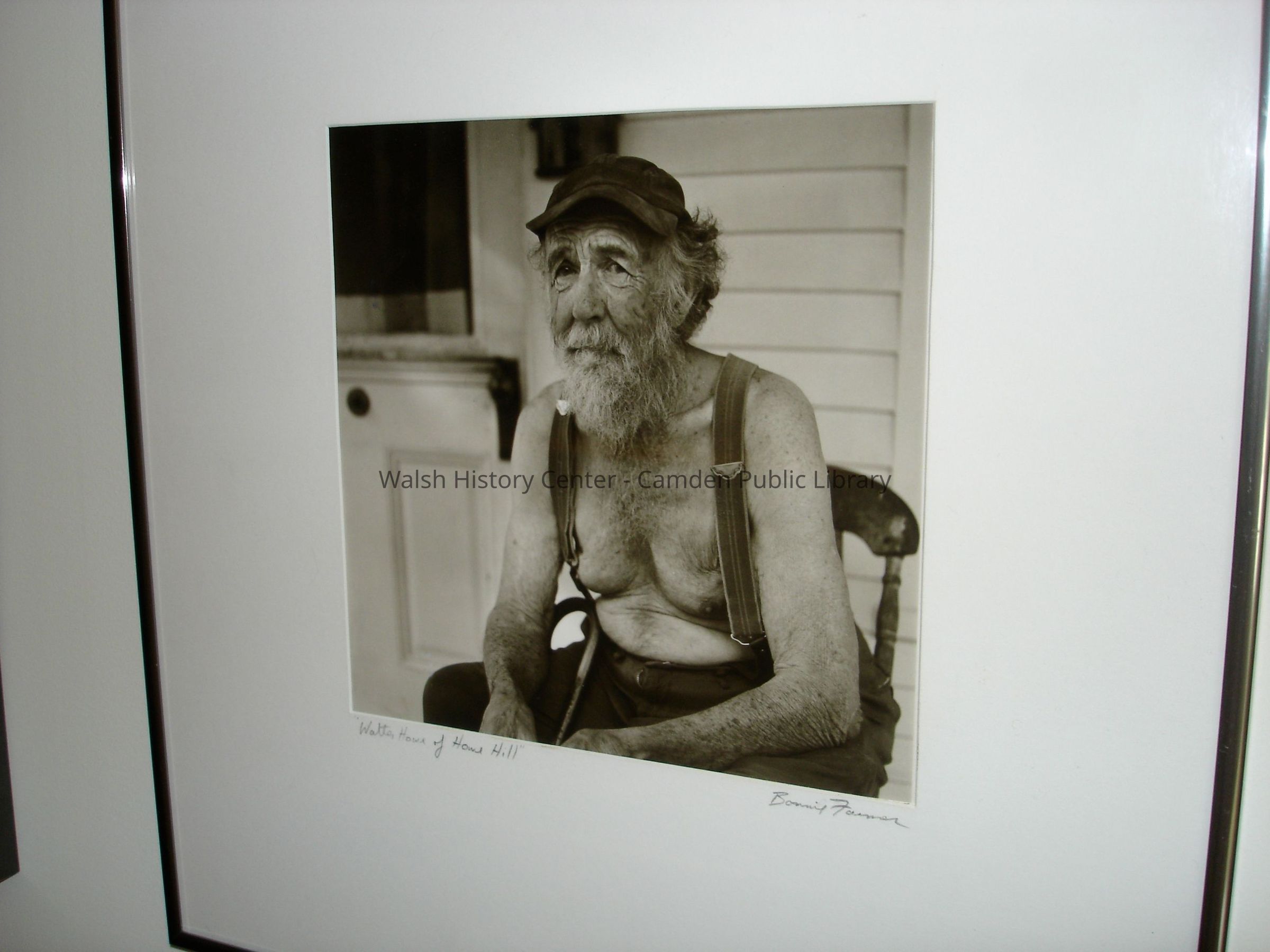 Black and white photograph of Walter Howe seated in a chair at his home on Howe Hill.Collection