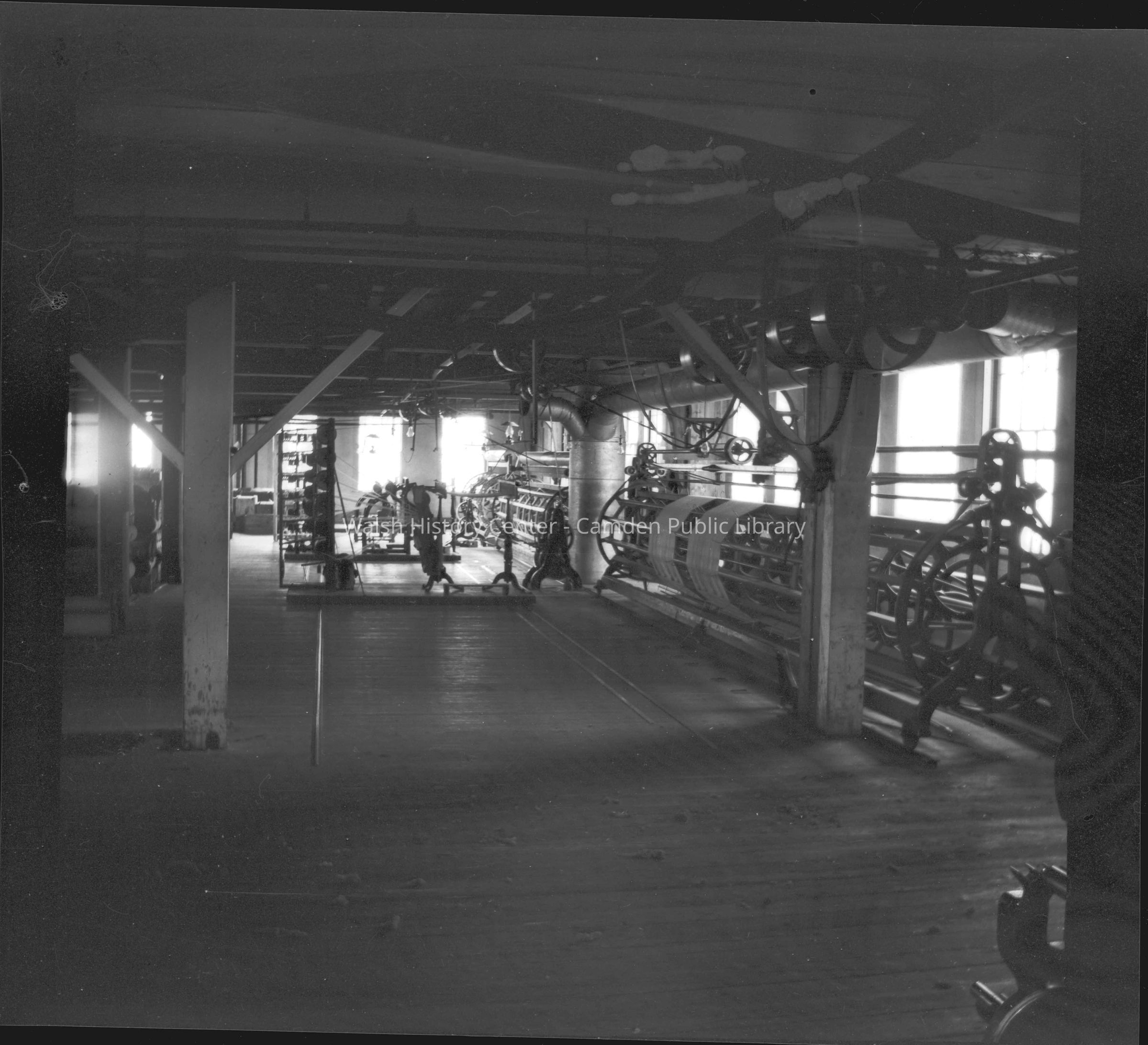 View of the interior of the Knox Woolen Company in Camden, Maine. Photo shows the process of warp dressing, where the loom warp yarns (machine direction threads) are prepared to be loaded into the looms.Collection